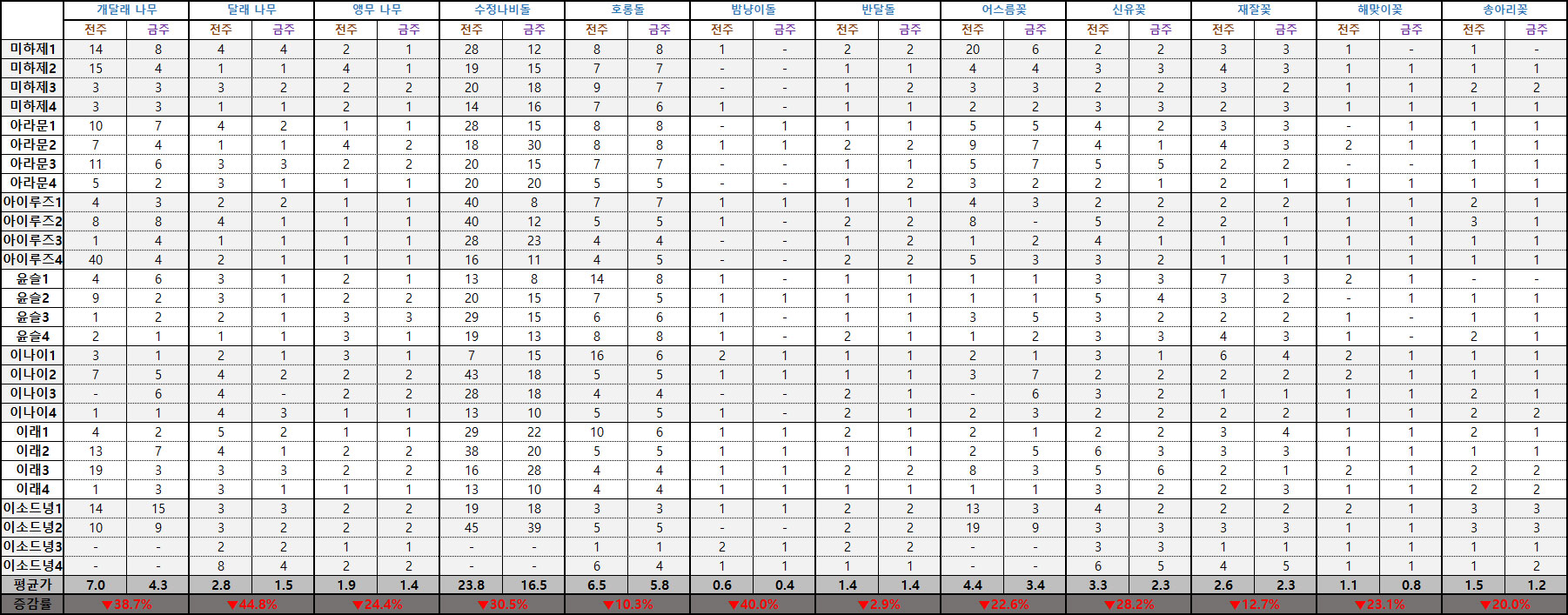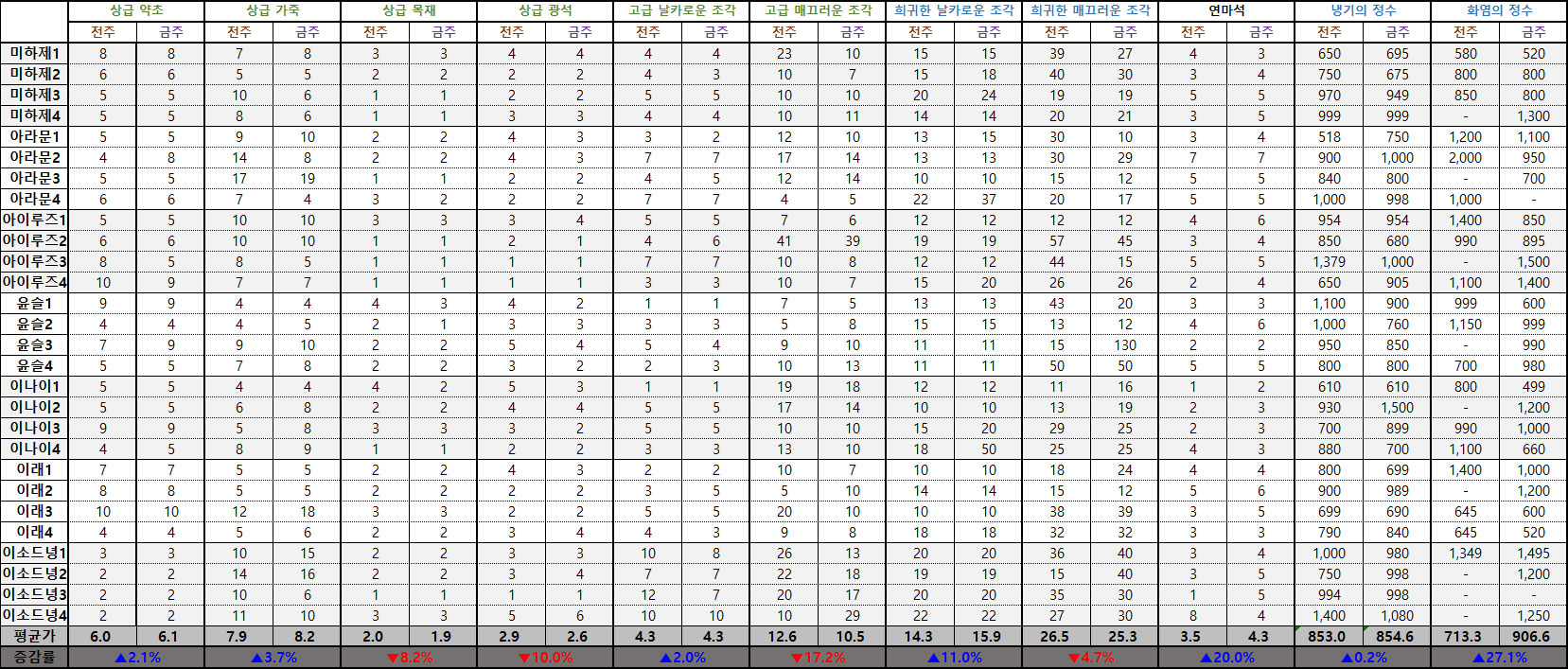 비교적 높은 가격에 거래되던 '개달래 나무'와 '수정나비돌'이 약 30% 이상 시세가 떨어졌다. 또 '냉기의 정수'는 지난주와 비슷한 가격을 유지하는 가운데 시세가 0.2% 상승했으며 '화염의 정수'의 7월 1주차 전 서버 평균 실시간 최저가가 '냉기의 정수'를 넘어섰다.