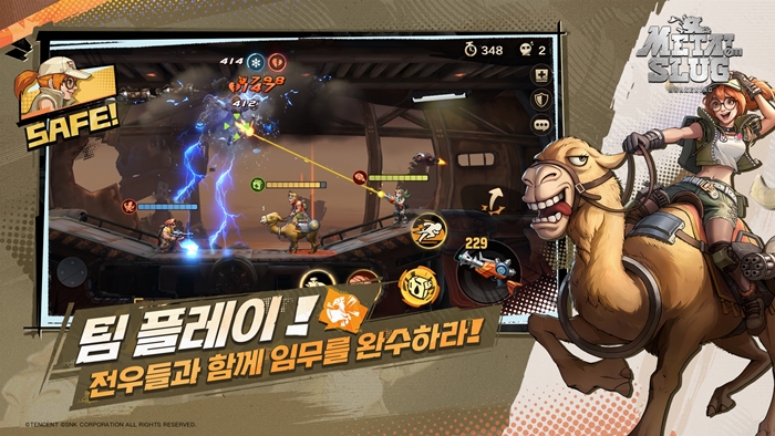 또한 팀 컨텐츠인 ‘협동 작전’에서는 다른 지휘관과 3인 팀을 구성하여 각 실드, 치료, 화력 중 하나의 능력을 선택하고, 제한 시간 내에 협력하여 보스를 공략하는 컨텐츠이다. 이번 작품에서는 ‘오락실에서 혼자 혹은 2인이서 플레이 하던 방식을 벗어나 다른 플레이어와 함께 협력해서 메탈슬러그를 즐길 수 있다면 어떨까’라는 아이디어에서 ‘협동 작전’ 컨텐츠를 추가했다고 밝혔다.