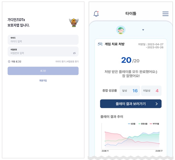 드래곤플라이는 ‘가디언즈DTx’의 탐색 임상시험과 병행하여 의료진과 보호자의 편의성을 증진하고자 각각의 플랫폼을 개발했다. 실시간으로 환자 수행 데이터를 시각화해 제공하여 환자 관리를 돕는 의료진용 사이트와 환자의 상태 기록, 알림, 치료 수행 모니터링 기능 등 실시간 관리가 가능한 보호자용 애플리케이션이다.