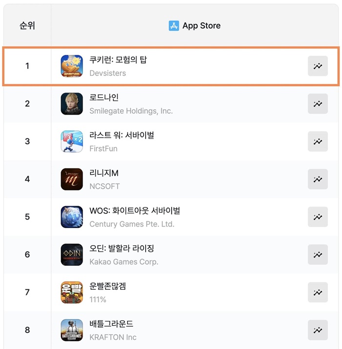 [자료제공 = 데브시스터즈] 데브시스터즈(대표 조길현)의 개발 스튜디오 오븐게임즈㈜(대표 배형욱)가 개발한 ‘쿠키런: 모험의 탑’이 국내 애플 앱스토어 게임 매출 순위 1위를 기록했다.