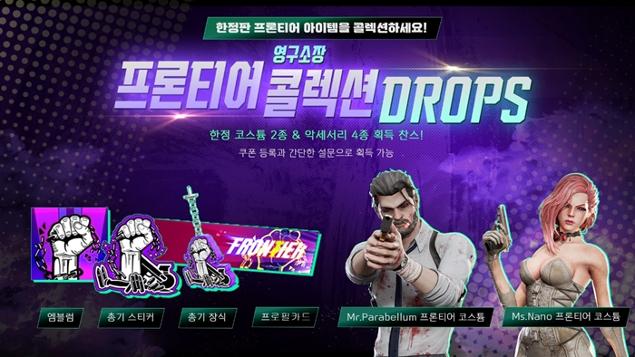 프론티어 컬렉션은 캐릭터 코스튬 2종, 총기 치장품 2종, 전용 프로필카드 2종으로 구성되며, 영구 소장이 가능해 추후 정식 서비스에서도 사용할 수 있다.