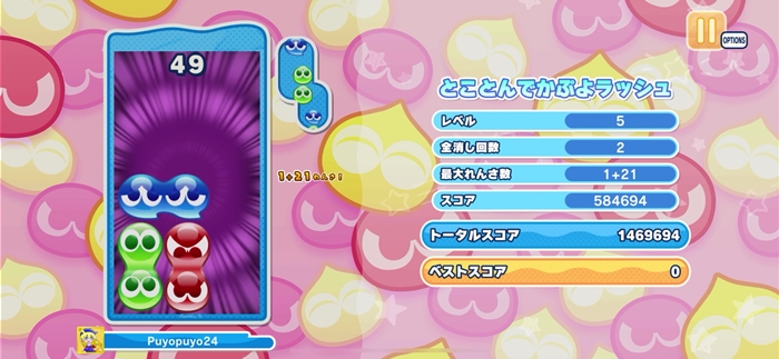 거대한 뿌요 3개를 이어서 지워야 하는 거대뿌요 러시가 끝없이 계속된다! 재빠르게 거대뿌요를 지워 덧붙이고 연쇄를 무한히 이어보자!