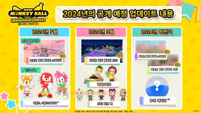 [자료제공 = 세가] 세가퍼블리싱코리아(대표 사이토 고)는 Nintendo SwitchTM용 소프트웨어 '슈퍼 몽키 볼 바나나 럼블'의 다운로드 콘텐츠(DLC) '세가 패스'를 통해 2024년 7월 31일(수) 오늘부터 테일즈, 너클즈, 에이미 3명의 플레이어블 캐릭터 배포가 시작되었다고 전했다.