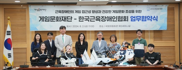 [자료제공 = 게임문화재단] 게임문화재단(이사장 김경일, 이하 재단)은 한국근육장애인협회(회장 정태근, 이하 협회)와 함께 근육장애인의 게임에 대한 접근성을 높여 사회적응과 희망을 키워가는데 상호 협력하기로 하고 8월 2일 국회의원회관에서 업무협약을 체결했다.