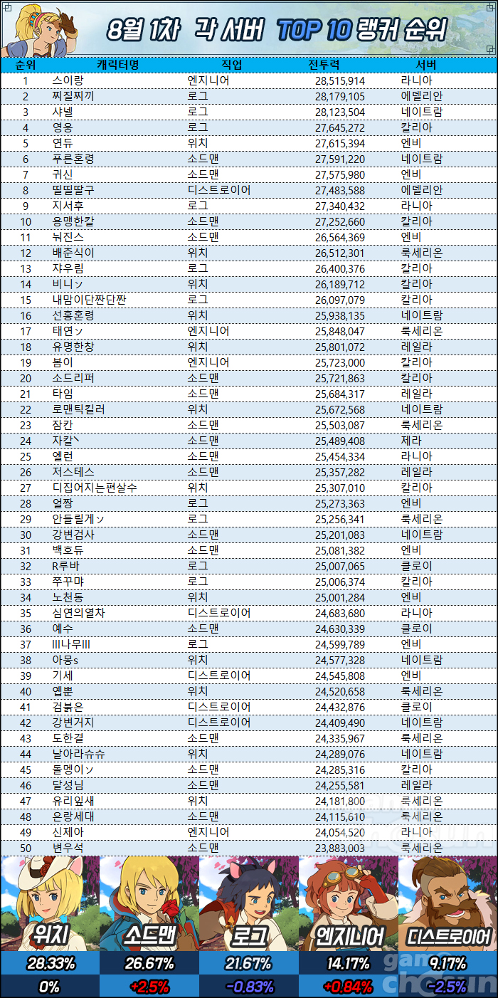 8월 1차 개인 랭킹 전 서버 전투력 1위는 라니아 서버 엔지니아 '스이랑'이다. 지난 랭킹에서 네이트람 서버 로그 '샤넬'에게 전투력 약 5만까지 추격을 허용했던 스이랑은 이번 랭킹에서 약 33만 상승한 전투력 2,851만 5,914로 1위를 사수했다. 반대로 샤넬은 지난 랭킹과 동일한 전투력을 기록, 에델리안 서버 로그 '찌질찌끼'에게 2위를 내주었다. 이제 1위와 2위의 전투력 차이는 약 33만. 당분간 스이랑의 독주는 계속될 것으로 보인다.