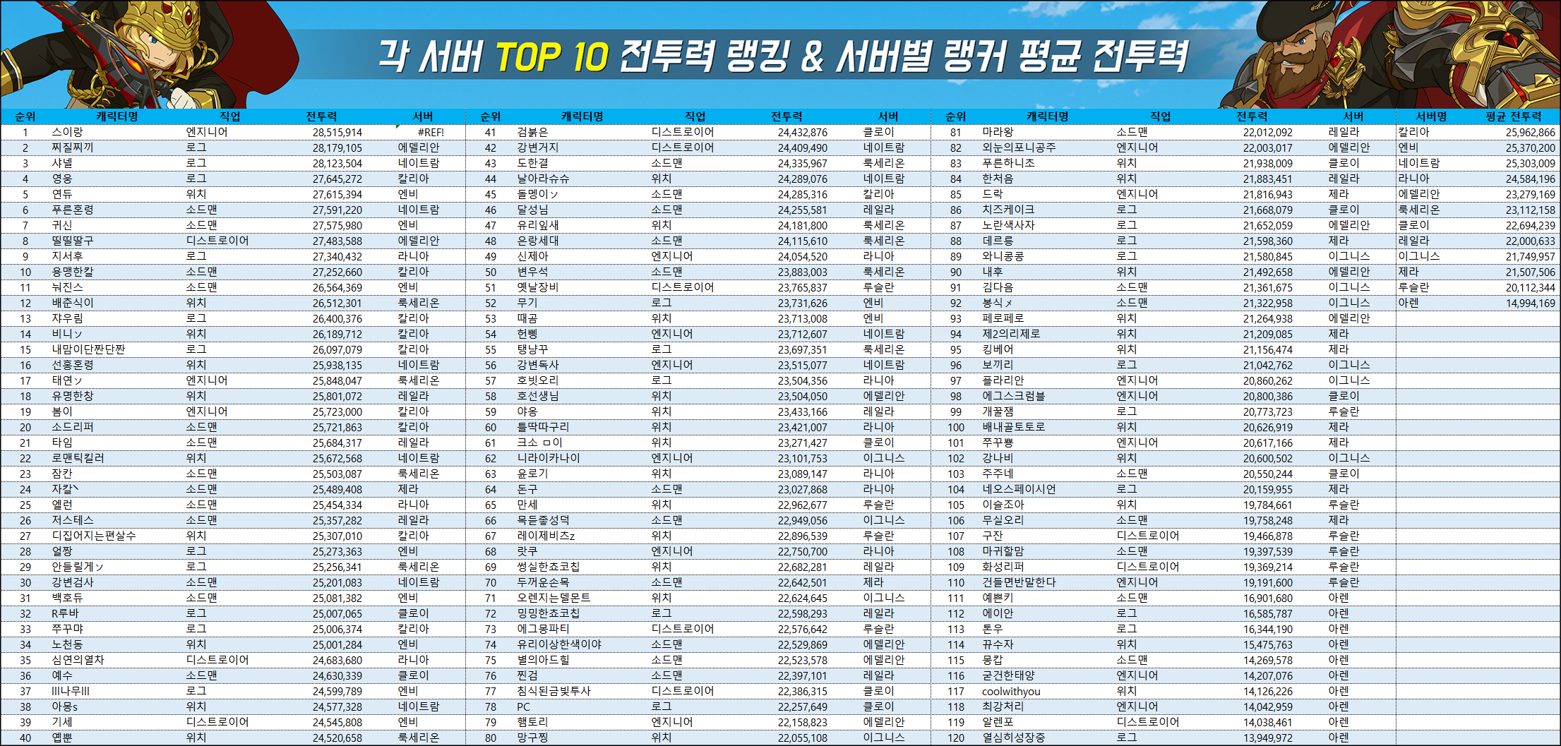 - 집계는 7일 10시부터 약 1시간 동안 실시됐으며, 누적 랭킹 메뉴의 캐릭터 전체 랭킹 항목을 기준으로 각 서버 상위 10명까지 선별했습니다. 집계 시간 동안 랭커들의 활동에 따라 전투력 및 직업에 오차가 발생할 수 있습니다.