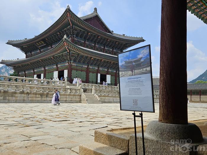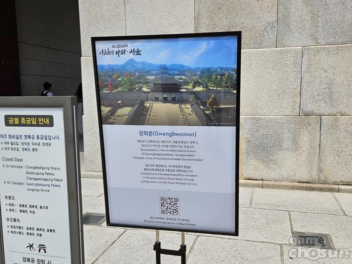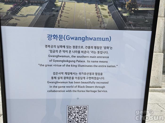 알림판에는 각가 광화문, 근정전, 경회루를 알리는 한글, 영어 안내와 함께 검은사막에 그대로 구현된 경복궁의 모습을 담은 영상이 QR코드로 담겨있다. 많은 외국인 관람객들이 해당 관광지를 구경 후 안내판을 읽고 QR코드를 찍으며 게임 내 구현된 또다른 경복궁을 구경하기도 했다.