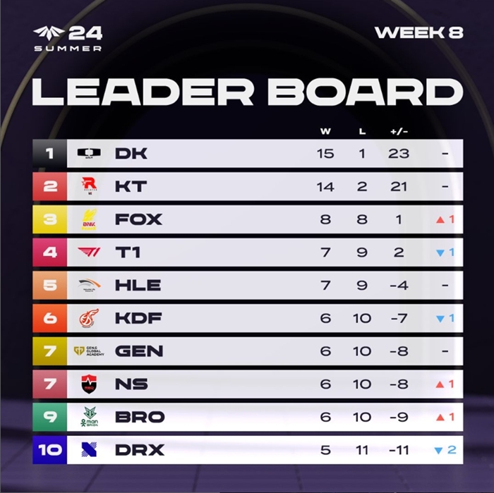 또한 이번주가 정규시즌 마지막 주임에도 4위부터 10위까지 단 2승 차이라, 7개 팀 모두 플레이오프 진출이 가능한 초유의 상황이다. 8주차까지 플레이오프 탈락이 한 팀도 나오지 않은 것은 LCK CL 출범 이후 처음이다.