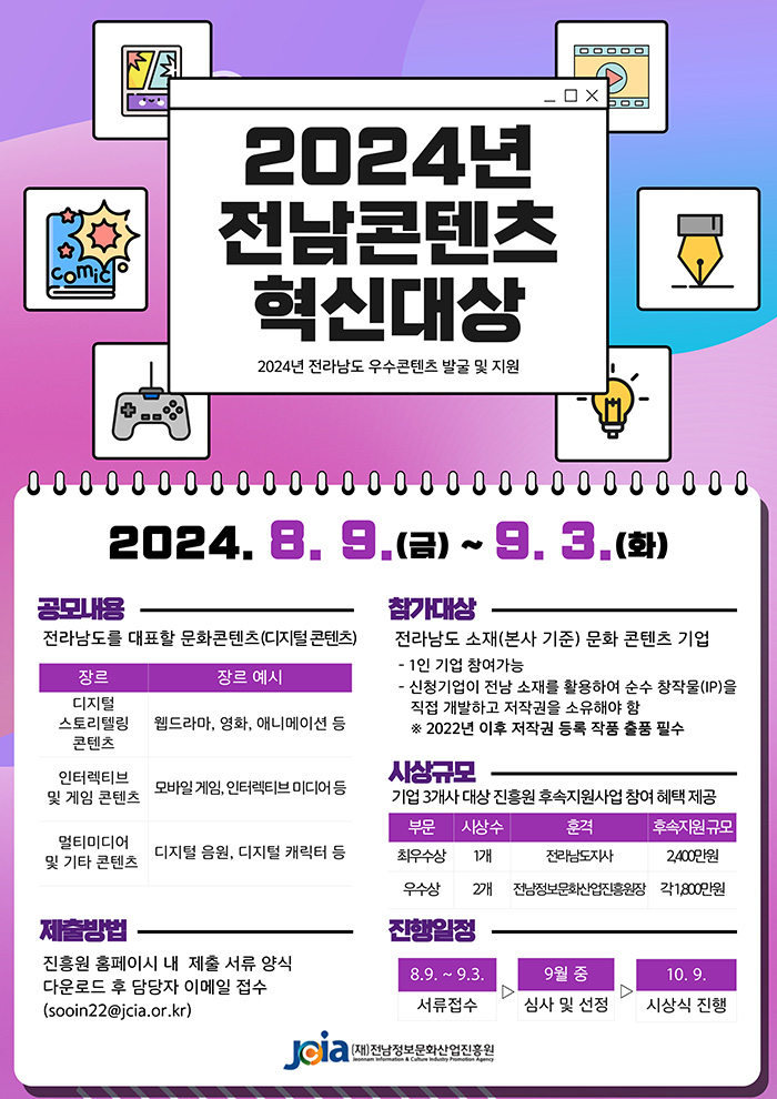 진흥원 이인용 원장은 “이번 공모전이 전라남도 내 콘텐츠 기업의 창의적이고 혁신적인 콘텐츠를 발굴하는 중요한 계기가 되기를 기대한다”며 “도내 콘텐츠 기업의 적극적인 참여를 바란다”고 전했다.