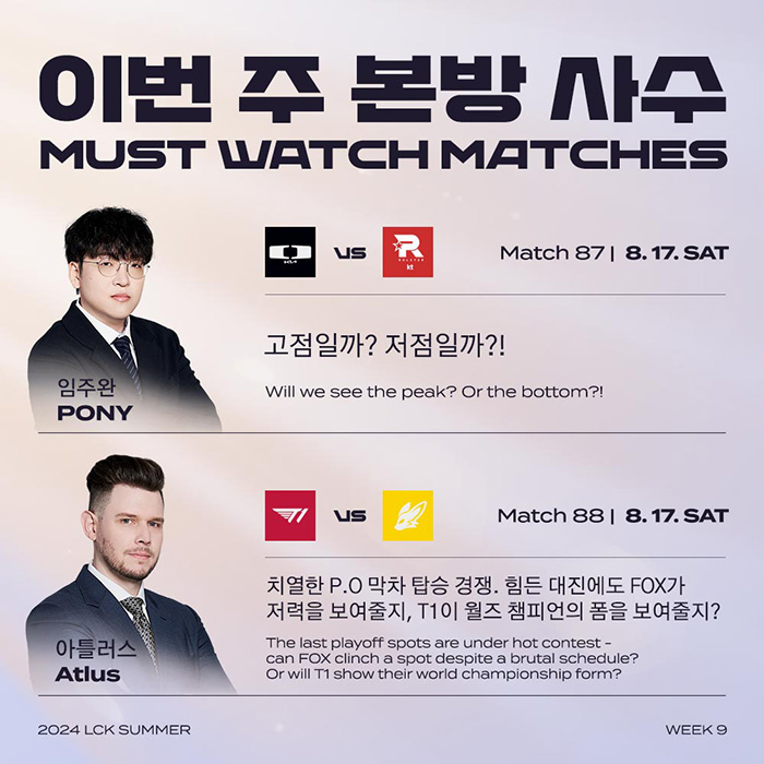 '포니' 임주완 해설 위원은 17일(토) 디플러스 기아와 KT 경기를 추천했다. 연승 행진 중이던 젠지를 꺾고 플레이오프 자력 진출의 희망을 다잡은 KT 롤스터가 고점의 경기력으로 3위인 디플러스 기아를 이길 수 있을 지 지켜봐야한다는 것이다.