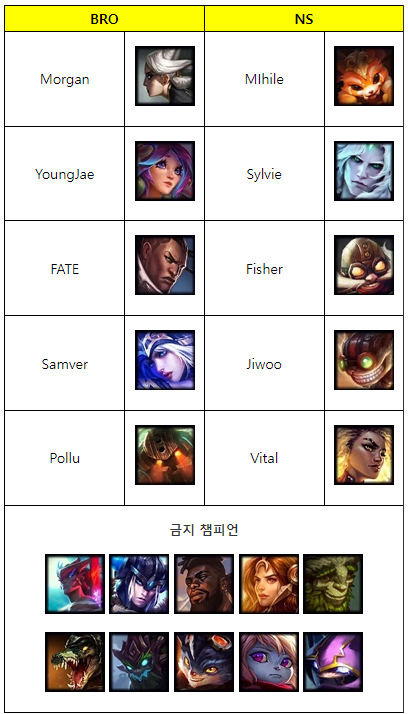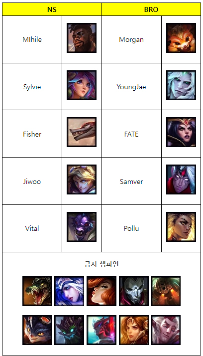 NS에서 쌍포 조합으로 빌드업을 하는 것을 보고 BRO에서 바루스를 기용하며 바텀 라인전을 확실하게 압도하겠다는 의지를 보여줬으나 피셔(이정태)가 나피리를 픽하며 LCK는 물론 4대 메이저 리그를 통틀어 처음으로 나피리가 대회 경기에 등장하게 됐다.
