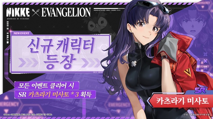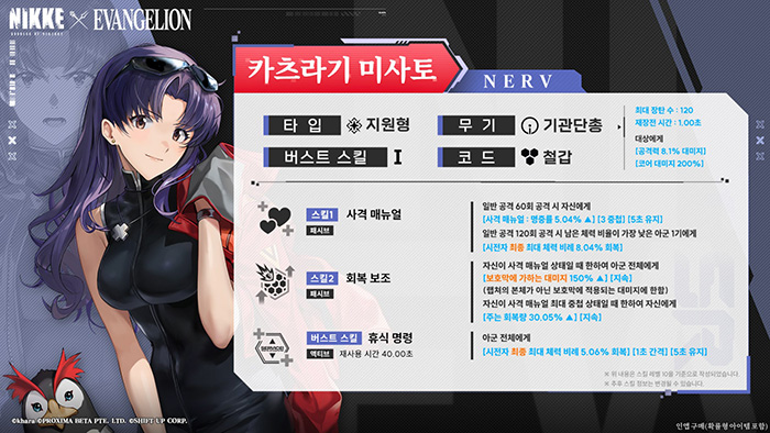 '시프트업'이 개발하고 '레벨인피니트'가 서비스하는 '승리의 여신 : 니케'가 '에반게리온'과의 대형 컬래버레이션 이벤트 'YOU CAN (NOT) EVADE.'에서 선보일 무료 배포 SR 캐릭터 '카츠라기 미사토'의 세부 스킬 제원을 공개했습니다.