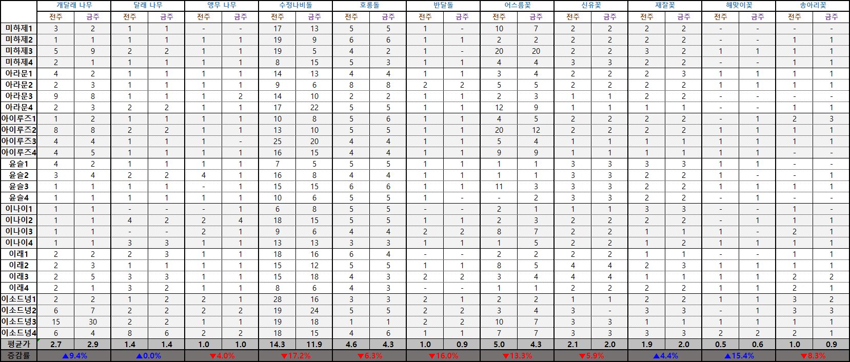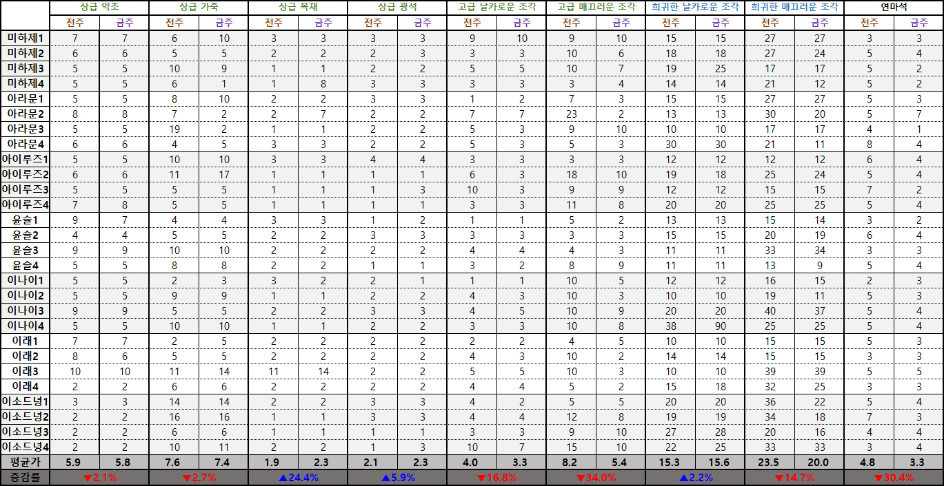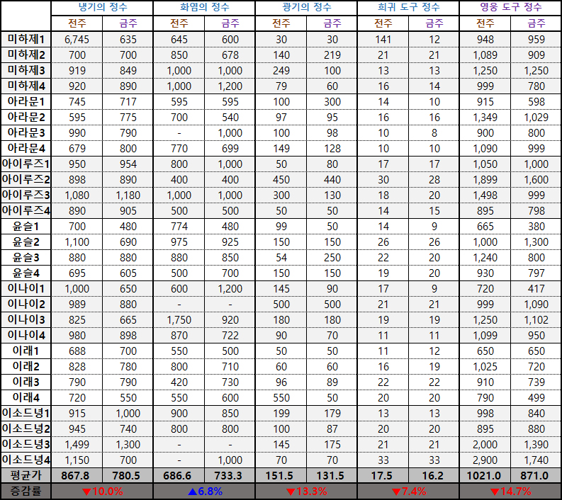 ※ 시세표 '평균가'는 이소드녕3, 4서버, 다라부루1, 2서버의 데이터가 제외된 수치입니다.