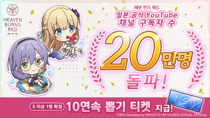 이와 더불어 일본 공식 YouTube 채널 구독자수가 20만명을 돌파하여 이를 기념해 S 이상 1명 확정 10연속 뽑기 티켓]을 지급한다.