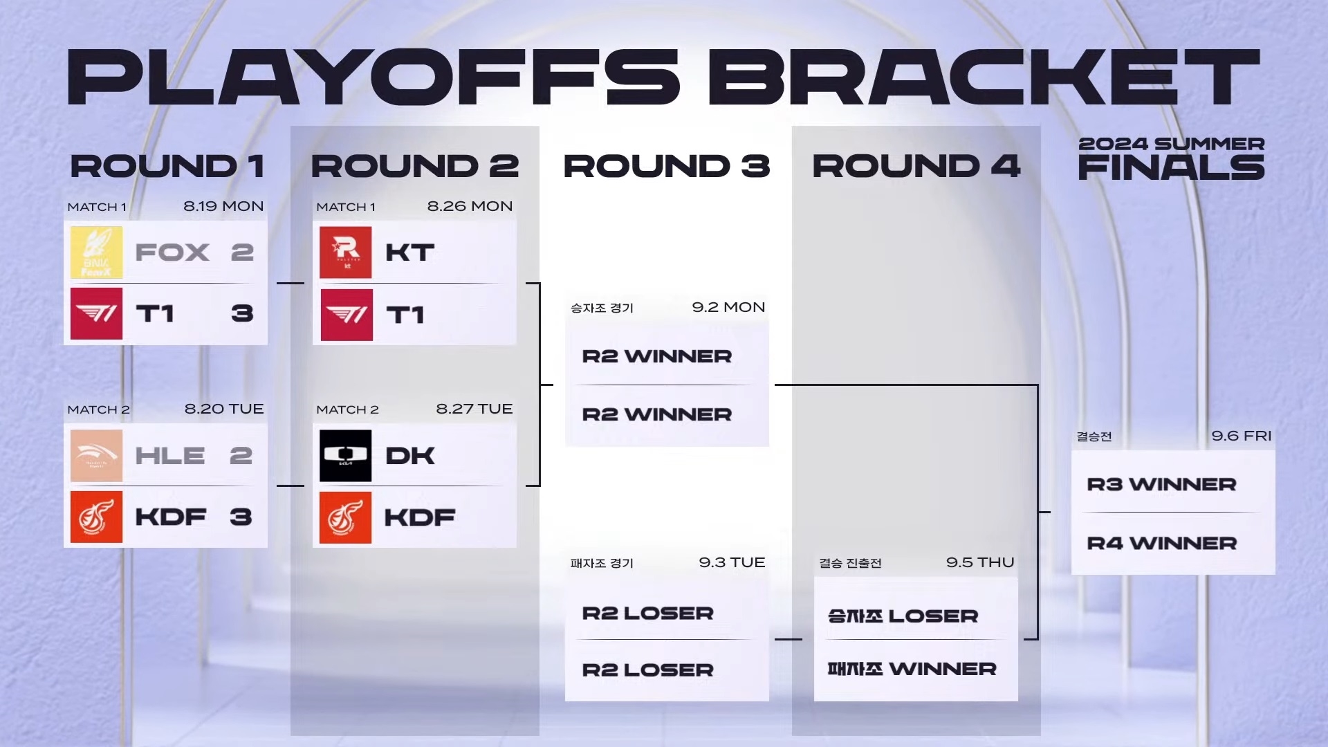 LCK CL 플레이오프 2라운드는 26일(월), 27일(화) 오후 5시부터 WDG e스포츠 스튜디오(서울 중구)에서 진행되며, 2라운드 승자는 오는 9월 2일(월) 승자조 경기에 진출하며, 패자는 9/3(화) 패자조로 이동하여 결승진출전 진출을 노린다.