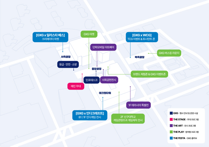 올해 축제는 크게 4개의 테마에 따라 ▲무대 프로그램 ‘THE STAGE(더 스테이지), ▲참여형 프로그램 ’THE PLAY(더 플레이)‘, ▲전시형 프로그램 ’THE ART(디 아트)‘, ▲GXG 콜라보레이션 프로그램 ’THE FESTA(더 페스타)‘로 구성된다. 특히 판교역 중앙 광장을 위주로 배치되는 ’THE PLAY’ 및 ‘THE ART’ 프로그램을 통해 다채로운 게임문화를 직접 경험할 수 있다.