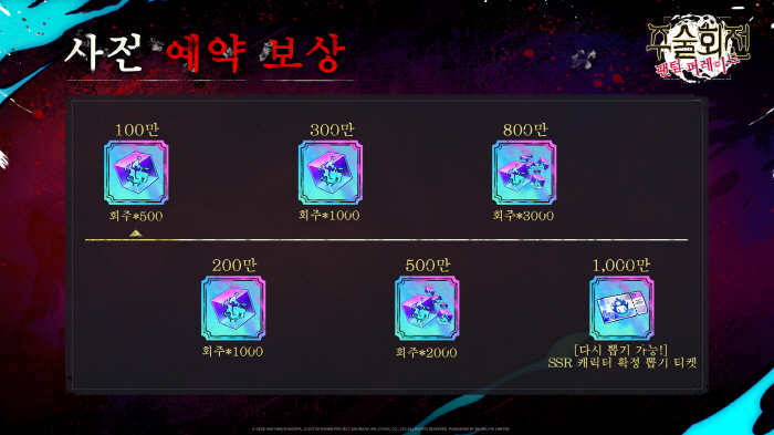 ‘주술회전 팬텀 퍼레이드’는 사전예약을 시작하며 다양한 이벤트를 역시 진행 중이다. 글로벌 사전예약 돌파 수에 따라 총 25회 뽑기가 가능한 회주를 지급하며 1,000만 명 돌파시 다시 뽑기가 가능한 SSR 캐릭터 확정 뽑기 티켓을 제공한다.