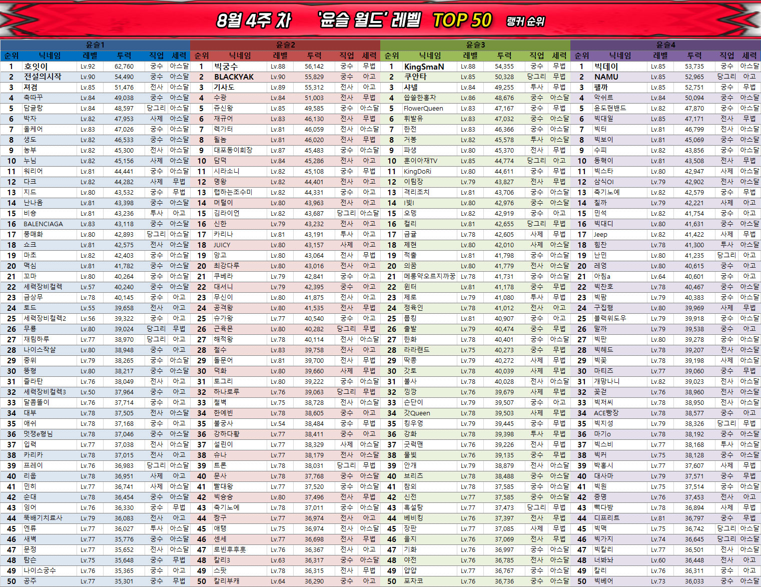 한편, 평균 레벨 또한 75를 넘어 세력전에 영향력을 행사할 수 있는 유저 수가 유의미하게 증가한 것으로 관측됐으며 랭킹 평균 전투력은 지난주에 비해 1,819 포인트 상승하며 아직 인플레이션이 끝나지 않았음을 시사하고 있다.