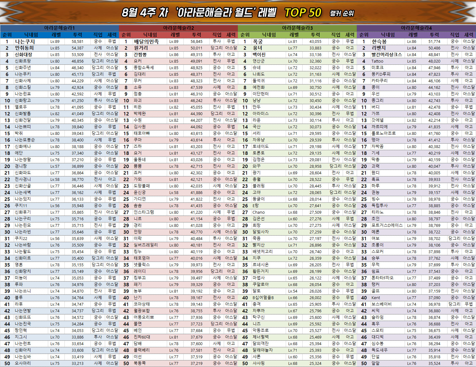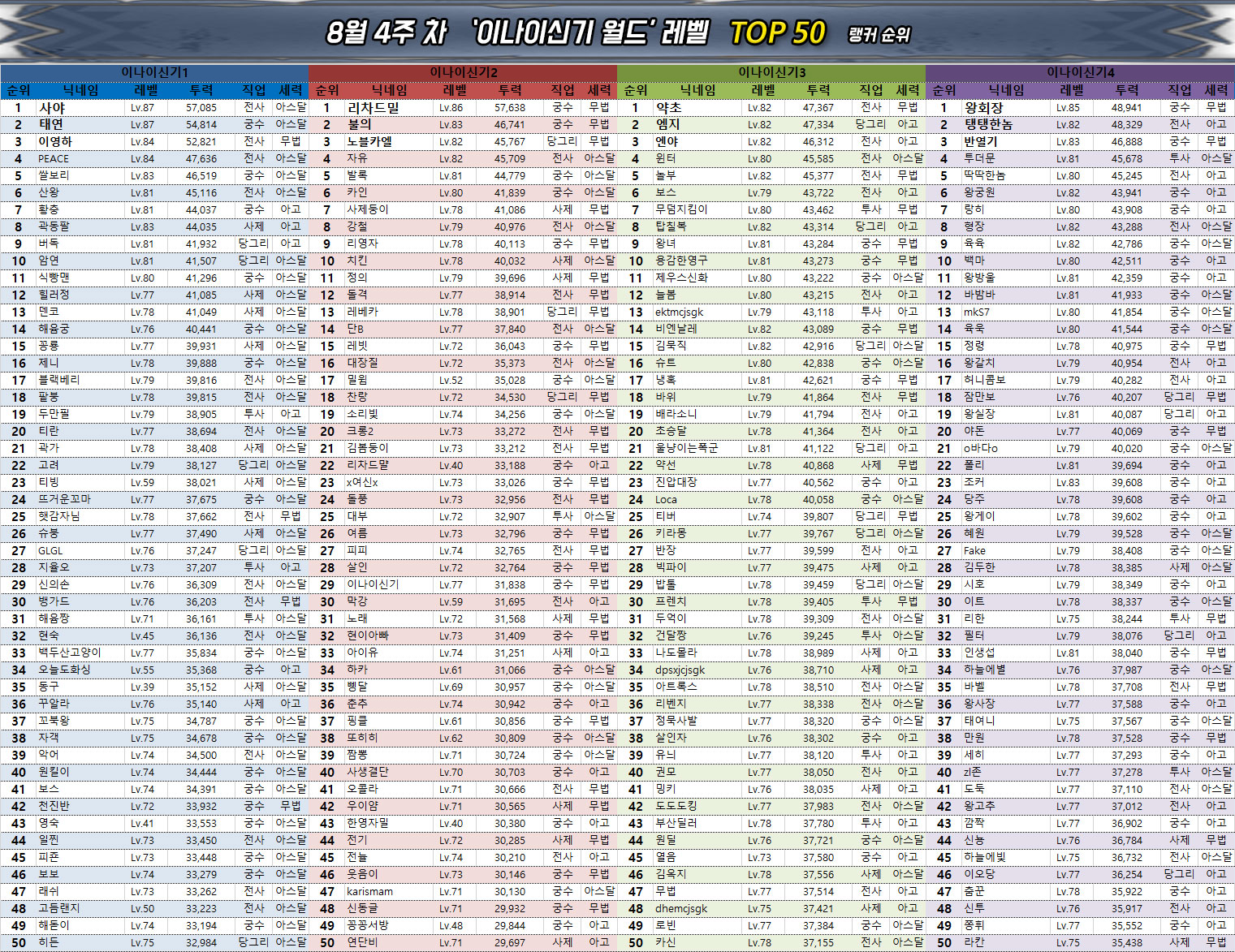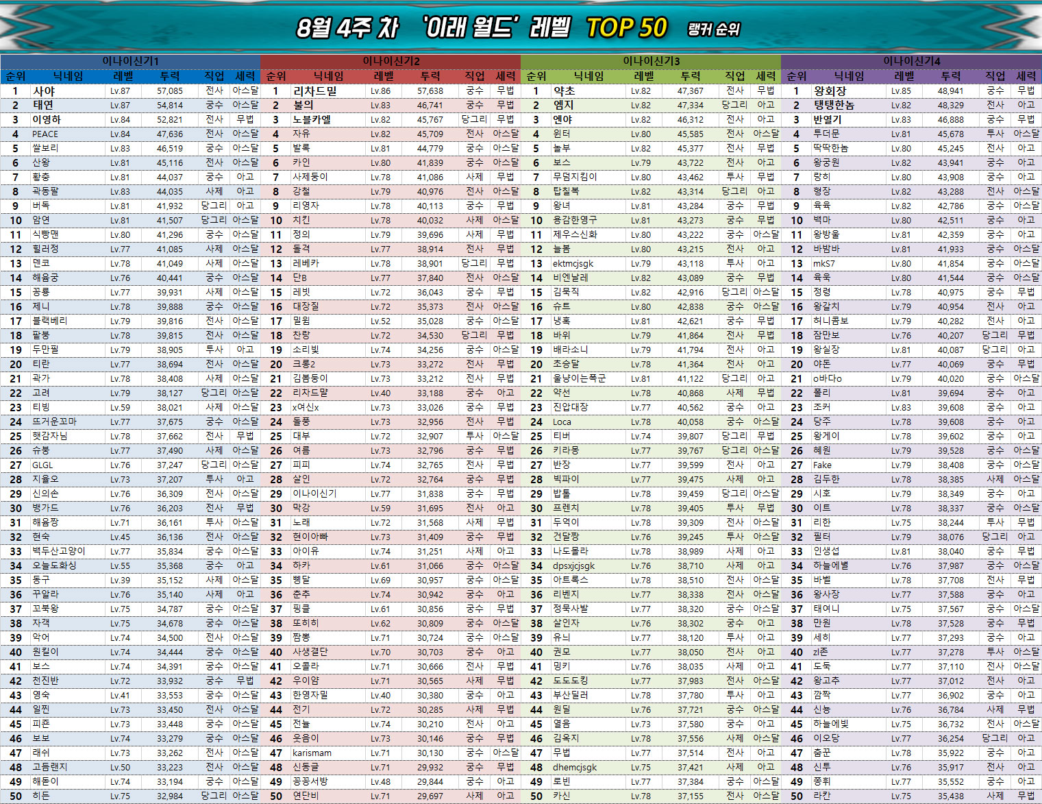 넷마블의 MMORPG '아스달 연대기: 세 개의 세력(이하 아스달 연대기)' 8월 4주차의 랭킹에서는 이레 2서버의 안정 유저가 2번째로 6만의 벽을 넘었으며, 아라문해슬라 1서버의 나는쿠지가 치열한 경쟁 끝에 이소드녕 1서버의 호잇이를 추월하며 3위로 올라서는 등 최상위 랭킹에서 큰 이슈가 다발적으로 발생했다.