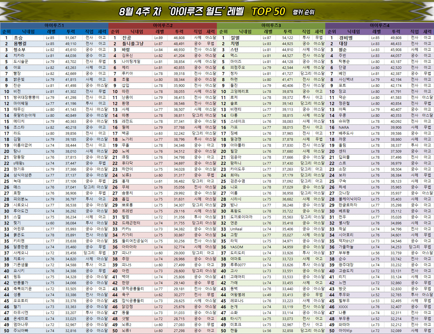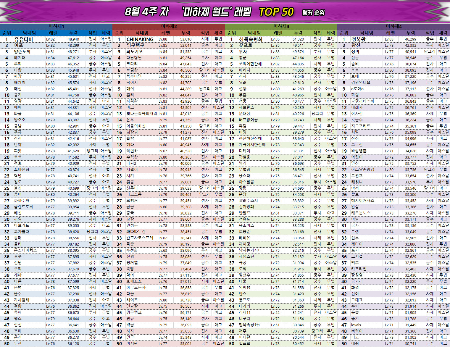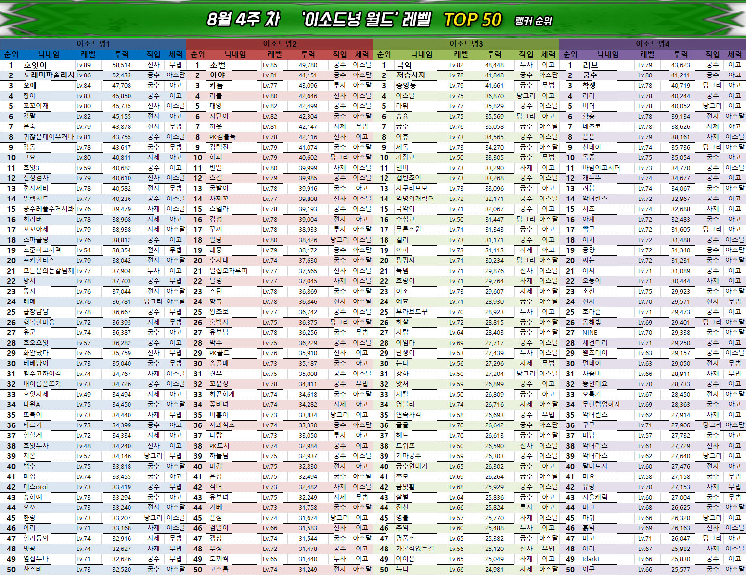 넷마블의 MMORPG '아스달 연대기: 세 개의 세력(이하 아스달 연대기)' 8월 4주차의 랭킹에서는 이레 2서버의 안정 유저가 2번째로 6만의 벽을 넘었으며, 아라문해슬라 1서버의 나는쿠지가 치열한 경쟁 끝에 이소드녕 1서버의 호잇이를 추월하며 3위로 올라서는 등 최상위 랭킹에서 큰 이슈가 다발적으로 발생했다.
