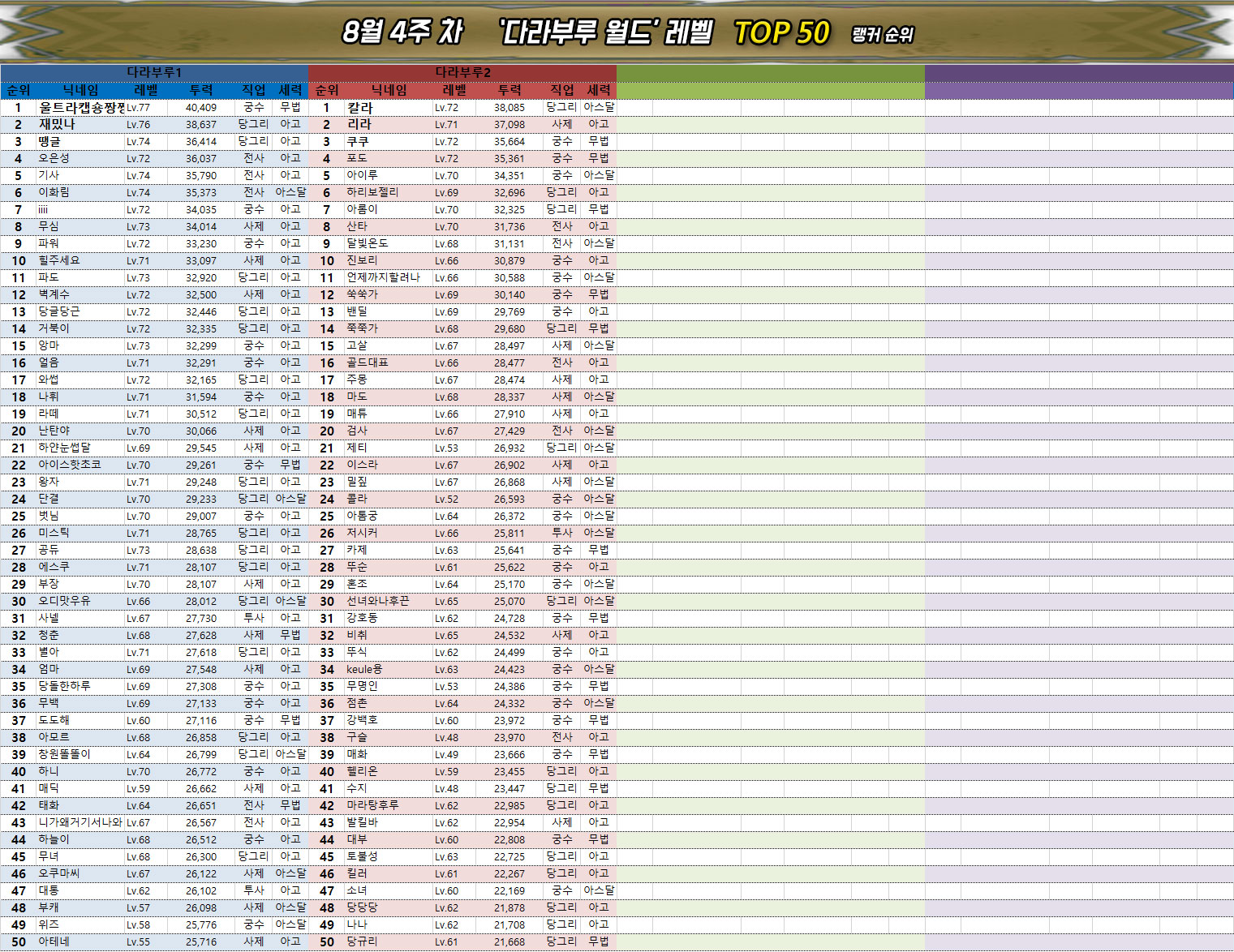 ※ 평균 전투력 및 레벨에서 다라부루1, 2의 데이터는 제외되었습니다.