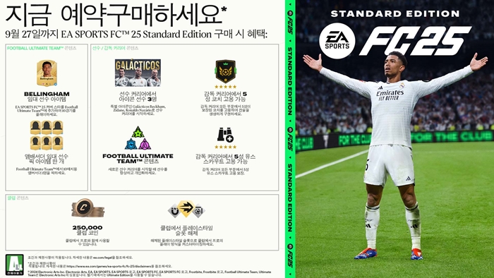 PlayStation®5, PlayStation®4, Nintendo Switch™ 'EA SPORTS FC™ 25' 패키지 제품의 예약판매는 8월 30일부터 9월 26일까지 다양한 게임 쇼핑몰 및 오픈마켓 등을 통해 진행될 예정이다. 제품의 국내 정식 발매일은 2024년 9월 27일이며, 심의등급은 전체이용가다. 예약판매 및 게임에 관한 자세한 정보는 게임 공식 홈페이지, 게임피아 블로그와 페이스북, 인스타그램에서도 확인할 수 있다.