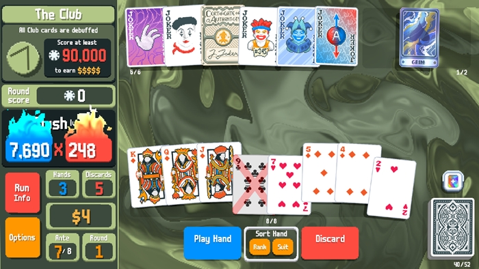 각 라운드에서 플레이어는 제한된 핸드 횟수와 버리기 수 내에서 다양한 조합의 카드 조합을 통해 블라인드에 필요한 점수를 획득해야 한다.