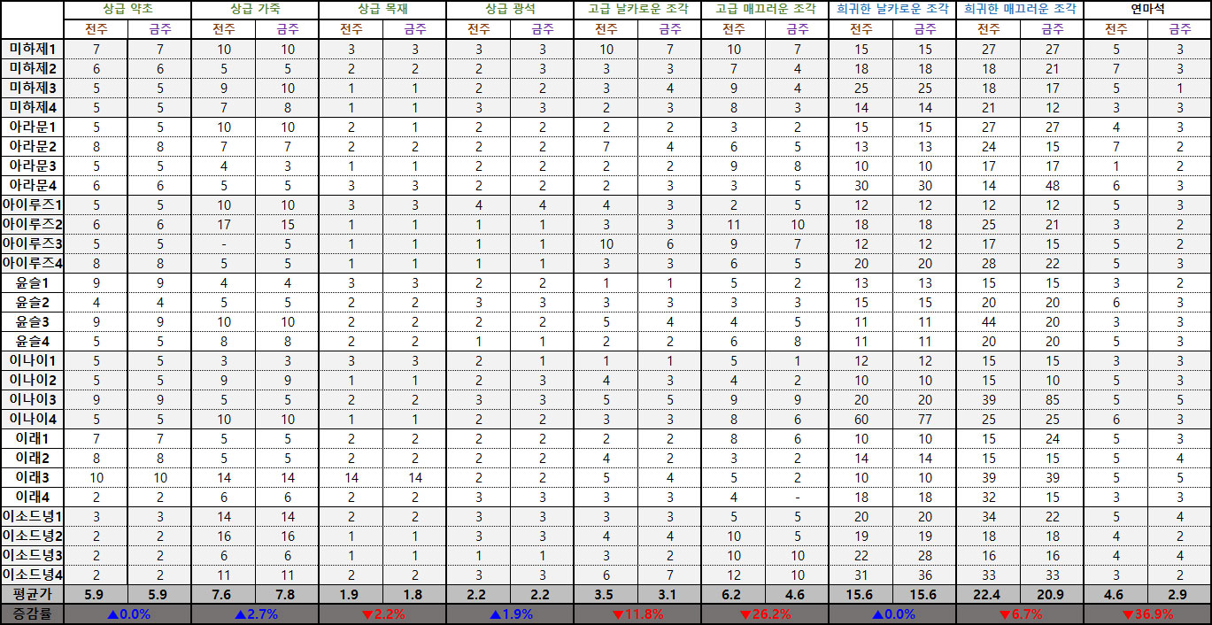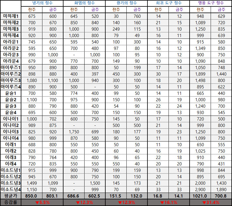 ※ 시세표 '평균가'는 이소드녕3, 4서버, 다라부루1, 2서버의 데이터가 제외된 수치입니다.