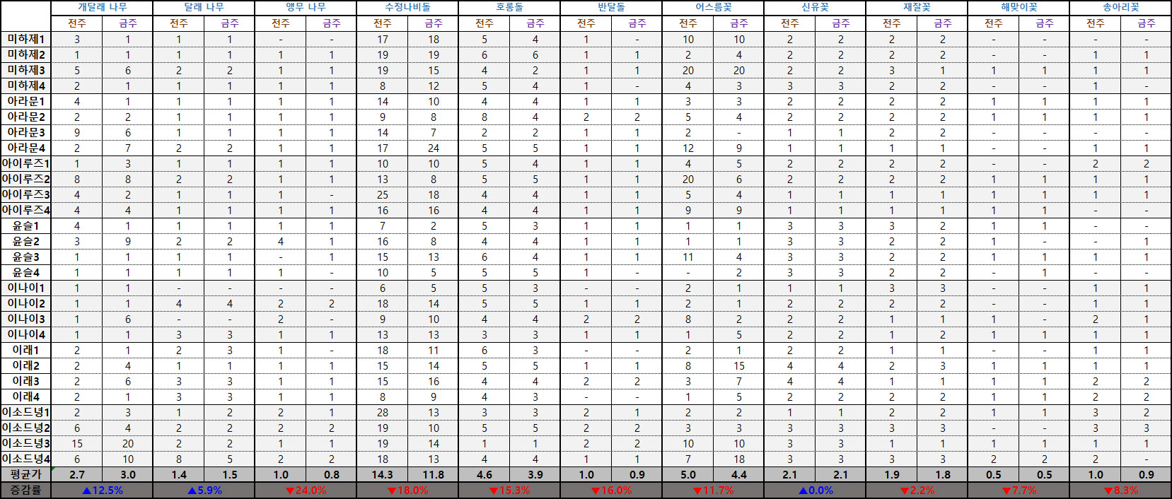 특히 앵무나무, 반달돌, 해맞이꽃, 송아리꽃은 아예 거래 내역 자체가 집계되지 않을 정도로 수요-공급라인이 완전히 끊긴 상황이기 때문에 취급에 주의가 필요한 상황이다.
