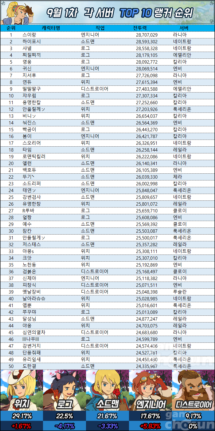 9월 1일 개인 랭킹 전 서버 전투력 1위는 지난 랭킹과 마찬가지로 라니아 서버 엔지니어 '스이랑'이다. 전투력은 지난 랭킹 대비 약 12만 상승한 2,870만 7,029를 기록했으며, 2위인 네이트람 서버 소드맨 '하이포시'와 차이는 11만이다. 지난 랭킹에서 스이랑을 2.4만 정도의 차이로 추격했던 네이트람 서버 로그 '샤넬'은 하이포시에게 3.5만 가량 밀리며 3위로 내려왔다.