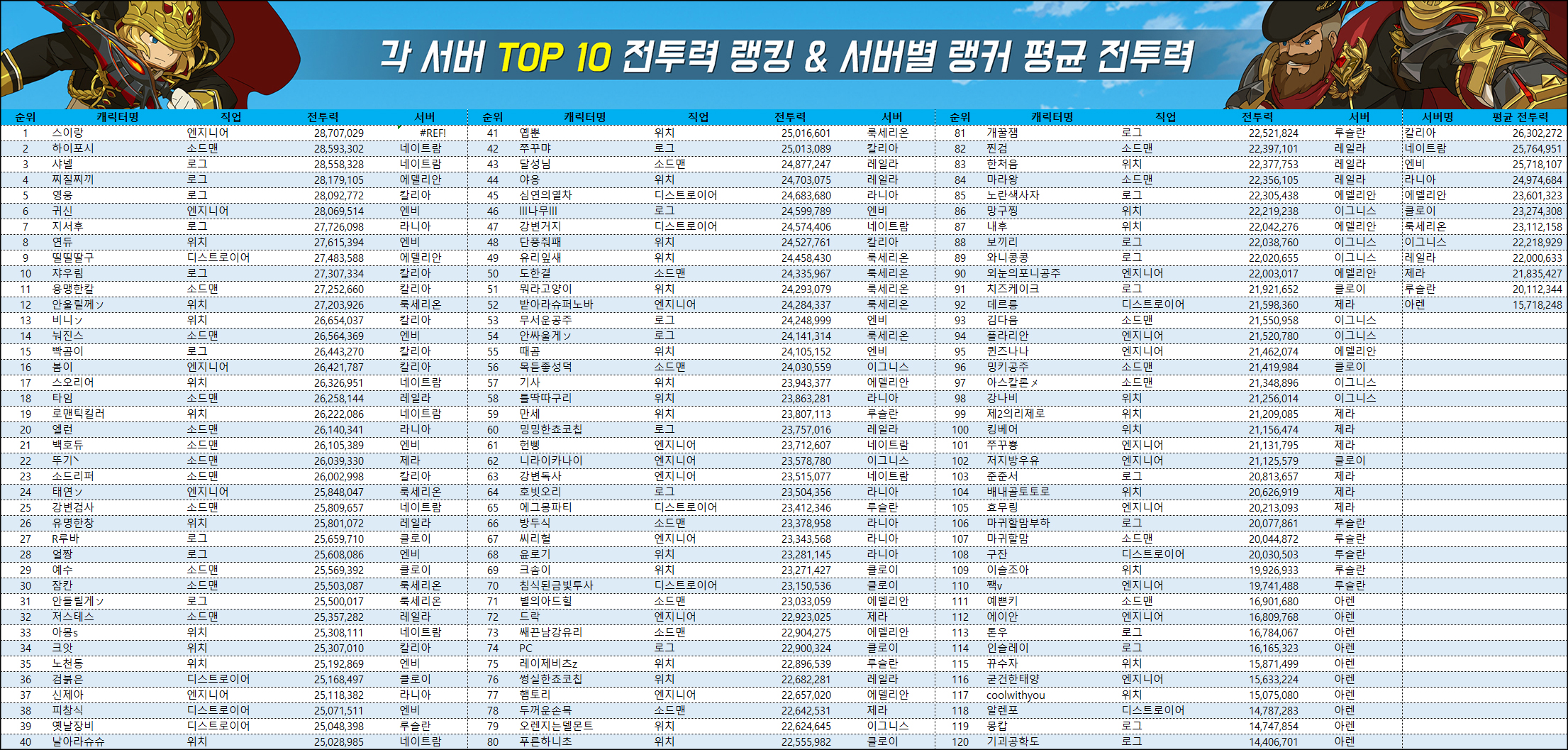 - 집계는 4일 10시부터 약 1시간 동안 실시됐으며, 누적 랭킹 메뉴의 캐릭터 전체 랭킹 항목을 기준으로 각 서버 상위 10명까지 선별했습니다. 집계 시간 동안 랭커들의 활동에 따라 전투력 및 직업에 오차가 발생할 수 있습니다.