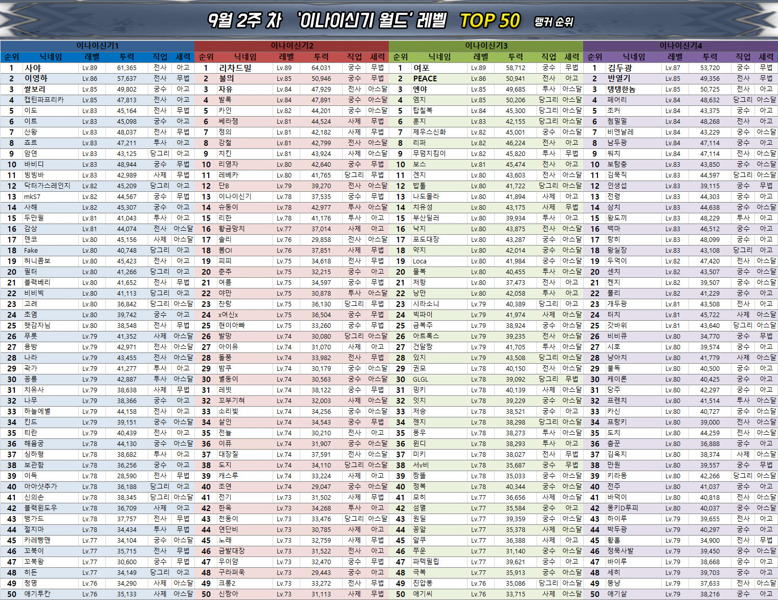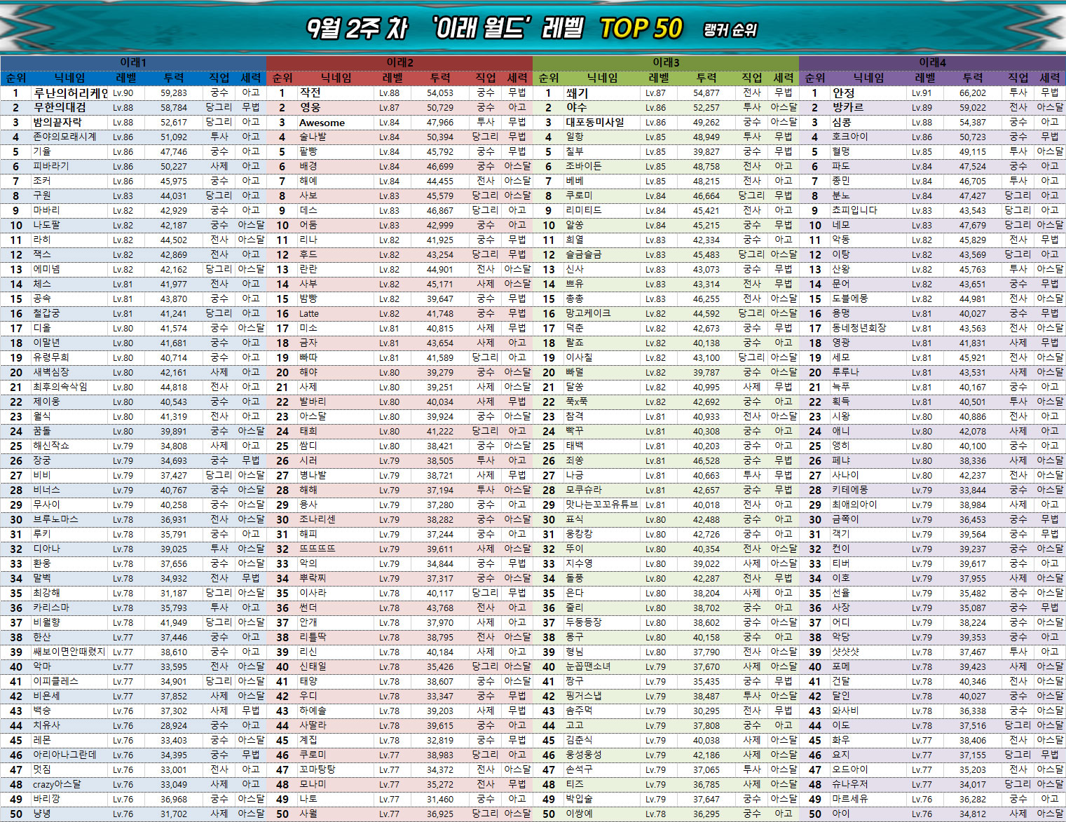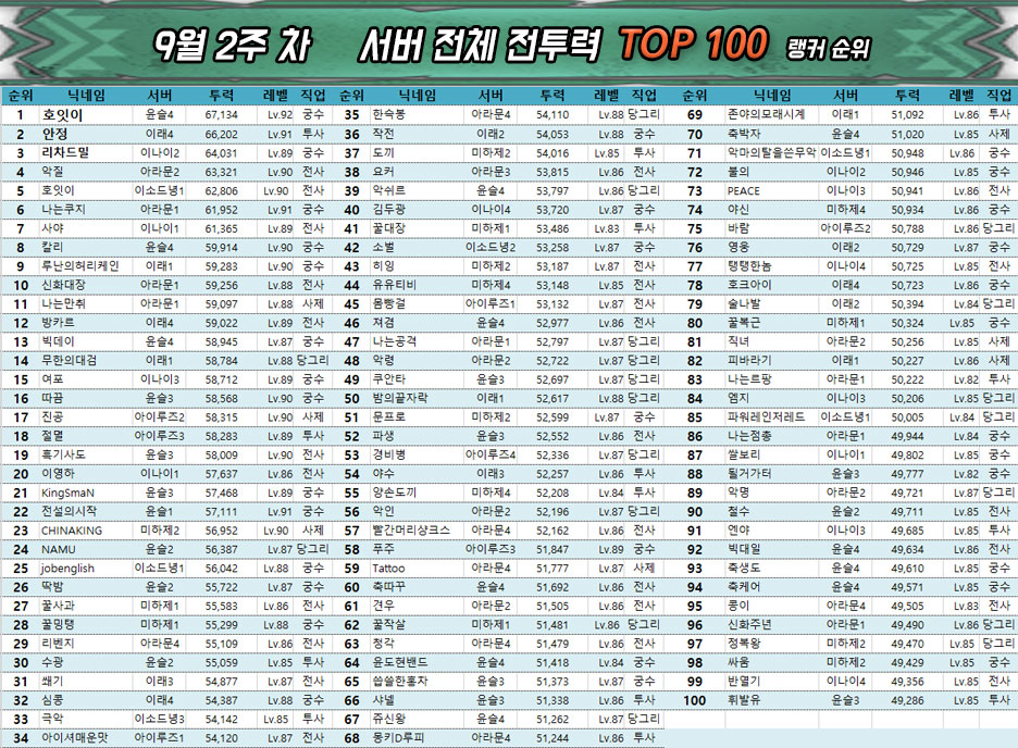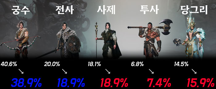 지난주와 동일하게 전사, 궁수 클래스는 점유율이 낮아지는 경향을 보이고 있으며 사제와 투사, 당그리는 나란히 상위 랭커들 사이에서 직업 변경권 사용 시 가장 선호받고 있다.