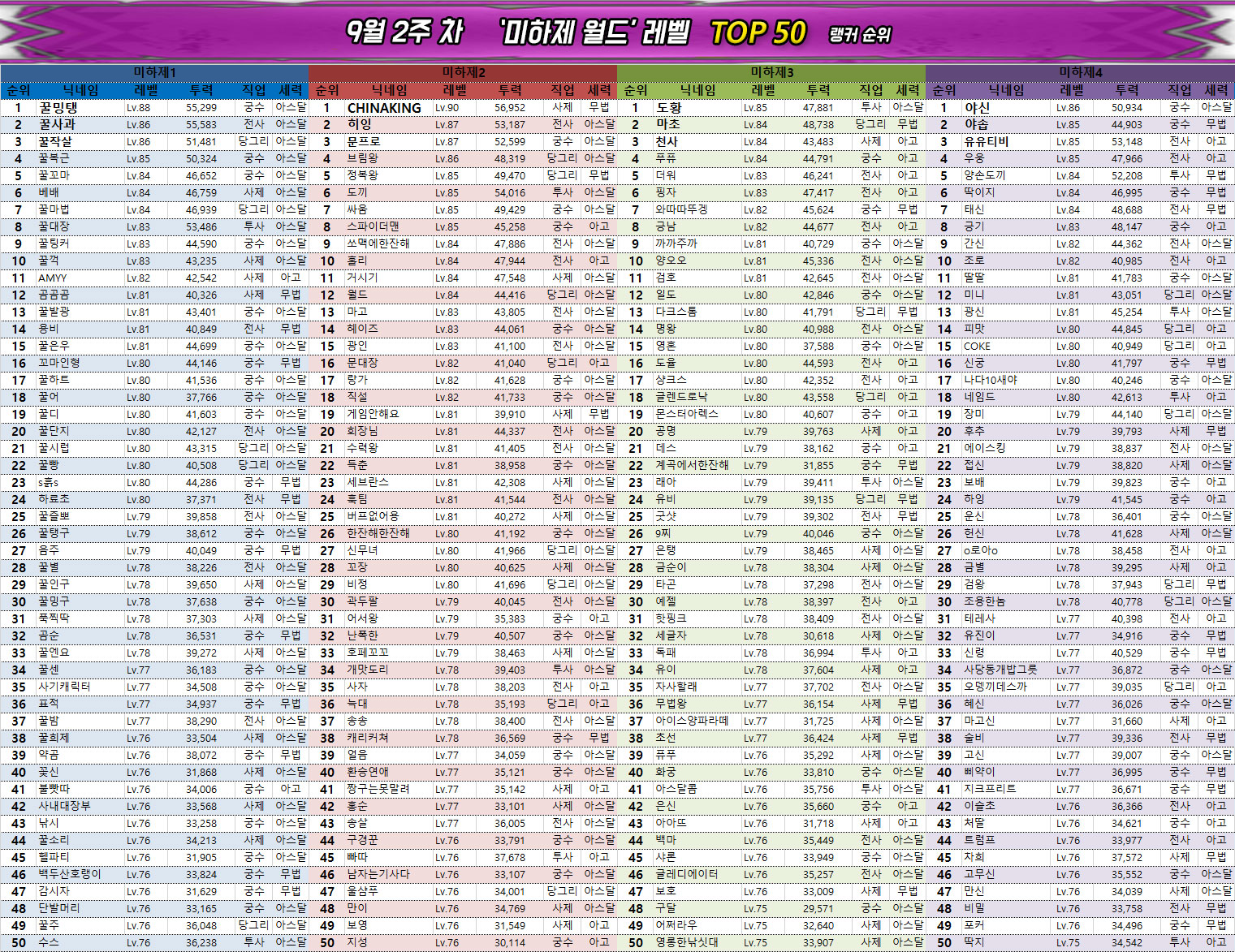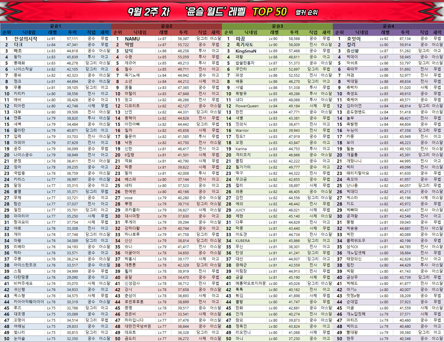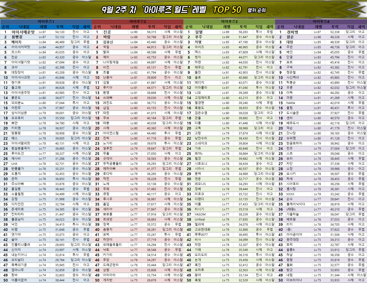 지난주와 동일하게 전사, 궁수 클래스는 점유율이 낮아지는 경향을 보이고 있으며 사제와 투사, 당그리는 나란히 상위 랭커들 사이에서 직업 변경권 사용 시 가장 선호받고 있다.