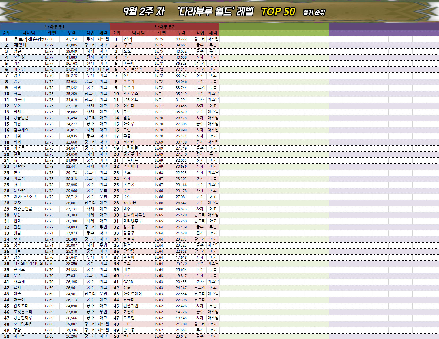 ※ 평균 전투력 및 레벨에서 다라부루1, 2의 데이터는 제외되었습니다.