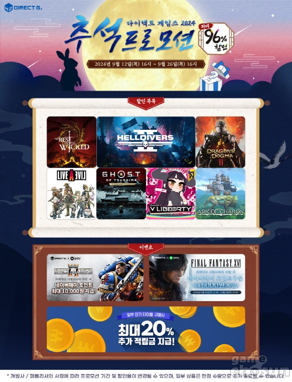 PC 디지털 유통 서비스인 다이렉트 게임즈에서는 9월 12일부터 9월 26일까지 추석 프로모션을 진행하며, ‘헬다이버즈 2’, ‘드래곤즈 도그마 2’, ‘고스트 오브 쓰시마 디렉터스 컷’, ‘노 레스트 포 더 위키드’ 등 신작과 인기 타이틀을 최대 96% 할인된 가격에 구매할 수 있다.