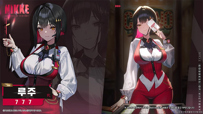 '루주'는 '블랑, '누아르'가 속해 있는 '777' 스쿼드의 마지막 퍼즐 조각으로, '1버스트', '지원형'에 '저격 소총(SR)'을 사용하는 '전격' 코드 니케입니다.