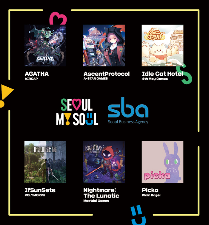올해 서울관 ‘GAME SHOW BOX’ 부스에 참가하는 12개 게임사 및 출품작은 ▲ CFK<식혼도~백화요란~> ▲ 주식회사 넥스트엘브이<크리타델 M> ▲ 포스메이게임즈(주)<고양이호텔> ▲ 주식회사 플레인베이글<피카> ▲ 주식회사 스토리타코<더티 크라운 스캔들> ▲ ㈜에이스타게임즈<어센트프로토콜> ▲ ㈜액션핏<블럭냥> ▲ 주식회사 이키나게임즈<지금 우리 학교는> ▲ ㈜버프스튜디오<레일블레이저> ▲ ㈜폴리모프<이프선셋> ▲ 주식회사 맷돌게임즈<나이트메어:더 루나틱> 이다.