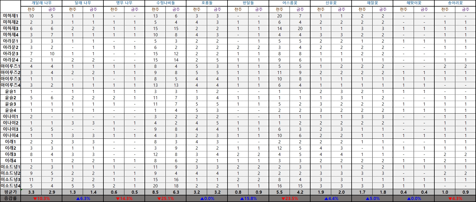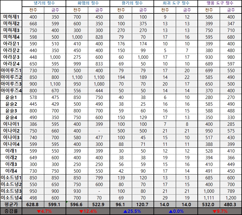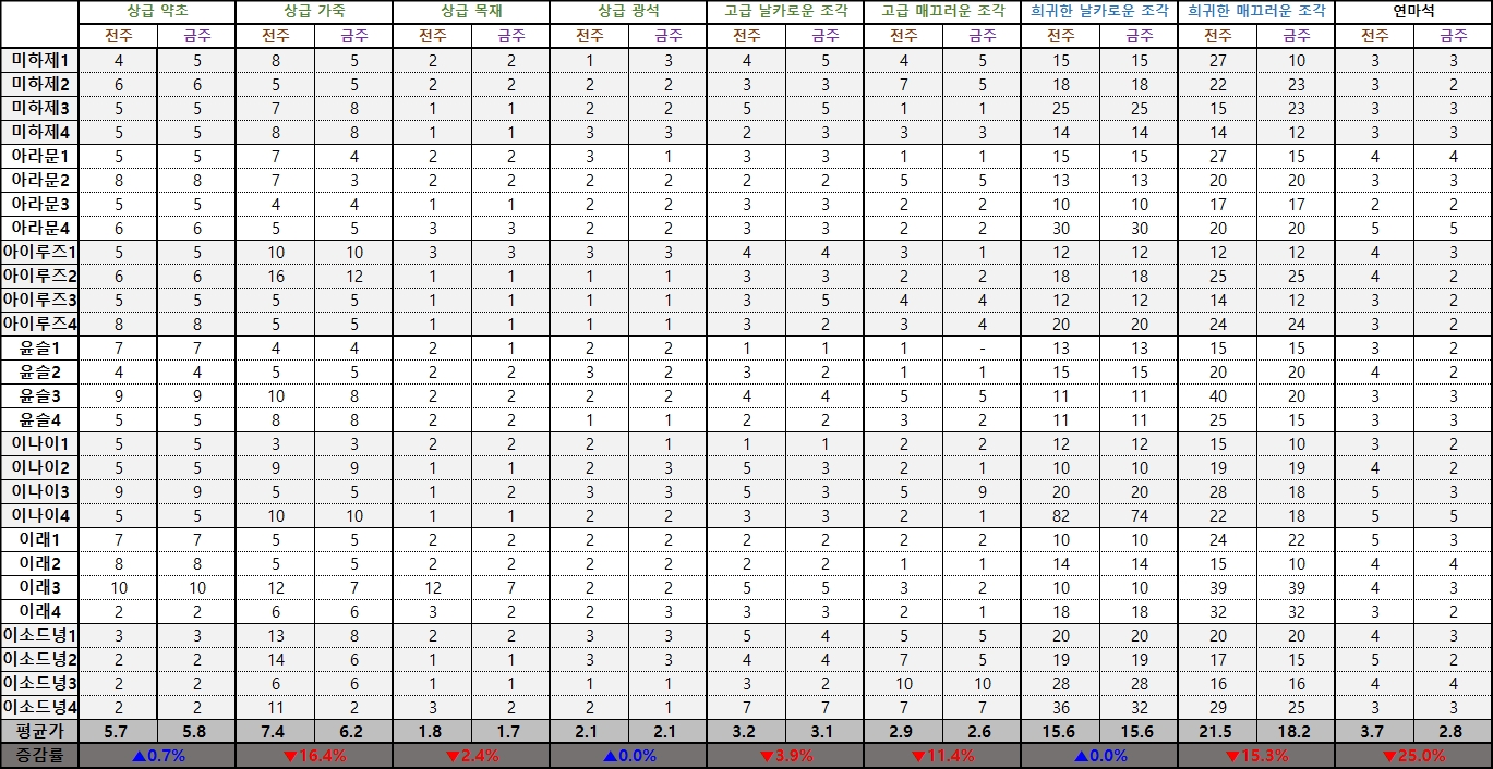 ※ 시세표 '평균가'는 이소드녕3, 4서버, 다라부루1, 2서버의 데이터가 제외된 수치입니다.