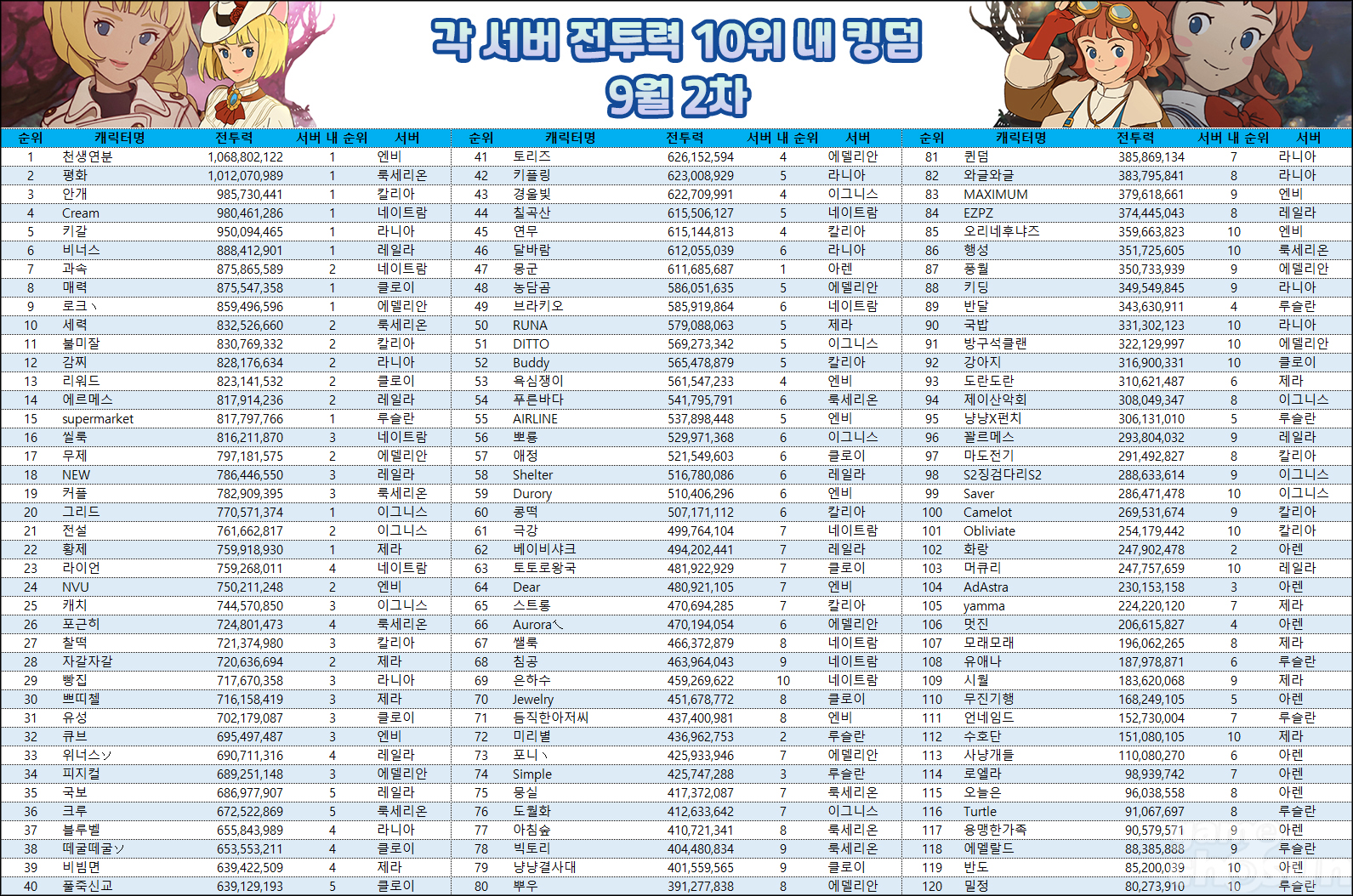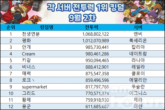 넷마블 제2의 나라 9월 2차 킹덤 전투력 랭킹 1위는 엔비 서버 '천생연분' 킹덤이 차지했다.