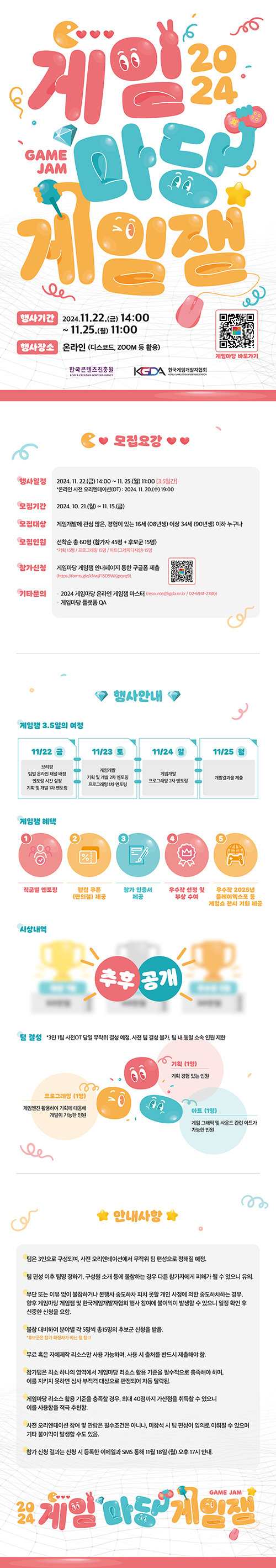 참가자 접수는 10월 21일 (월) 오전 9시부터 11월 15일 (금) 오후 6시까지이며, 사전 오리엔테이션(OT)은 11월 20일 (수) 저녁 7시(19:00)부터 게임잼 주제 발표, 심사기준 공유, 멘토링 안내 및 팀 결성 등의 내용으로 60분 정도 진행될 예정이다.