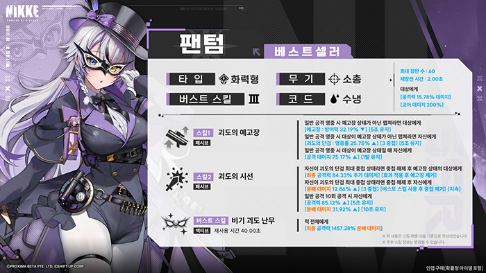 한편, 함께 공개되는 '팬텀'은 이번에 최초 공개된 '베스트셀러' 스쿼드의 첫 등장 니케로, 딜러가 귀한 '엘리시온' 그리고 '수냉' 코드의 화력형 파츠로 등장했다.