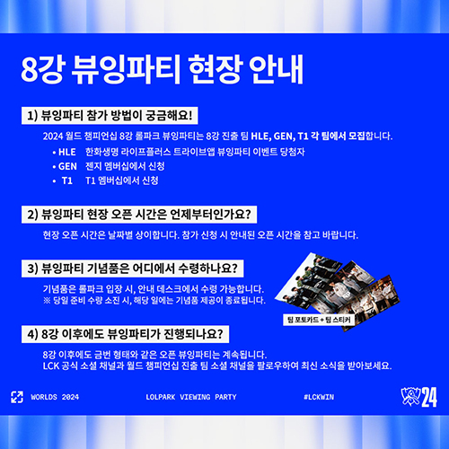 LCK는 월드 챔피언십에 출전한 LCK 팀들이 8강 경기를 치르는 18일부터 20일까지 서울 종로구 그랑서울에 위치한 롤파크에서 뷰잉 파티를 진행한다. 경기 시작 1시간 전인 오후 8시부터 로비를 오픈할 계획이지만 현장 운영 상황에 따라 변경될 수 있으며 입장 인원 또한 안전상의 이유로 제한될 수 있다.