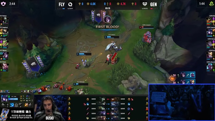 부시오의 라칸은 극초반부터 적극적인 로밍플레이로 GEN 측의 솔로 라이너들에게 소환사 주문 소모를 강제하고 다니면서 GEN은 어느정도 신중하게 라인전을 진행한다.