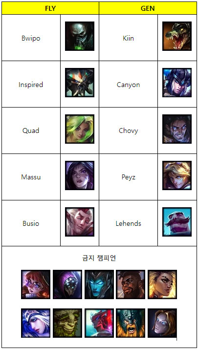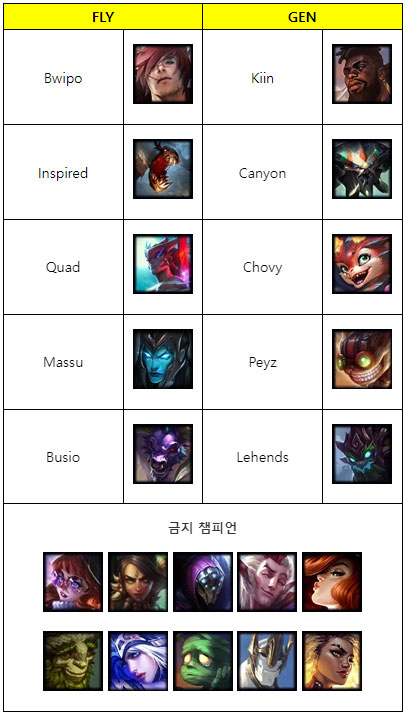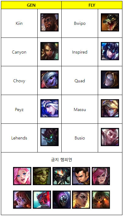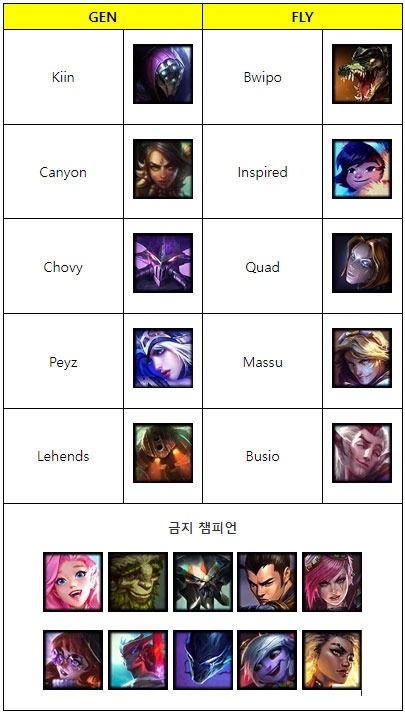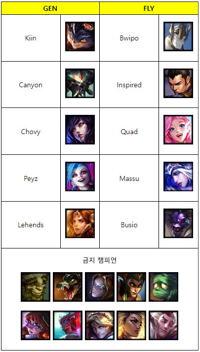 GEN은 스위스 스테이지에서 FLY가 구사한 아이번, 카시오페아, 아무무 등의 변수픽 차단에 중점을 두는 기조를 보였고 반대로 FLY는 애쉬-세라핀을 통해 초장거리 CC 연계로 선공권을 쥐는 대신 이들을 위협할 수 있는 라칸-렐 등의 교전 특화 서포터들을 잘라낸다.