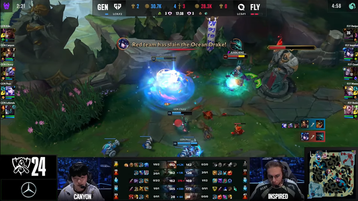 게임의 향방을 가른 한수는 17분에 나왔다. FLY측에서 인원을 과감하게 4명 투자하여 드래곤에 집중하자 GEN은 탑 라인을 지키고 있던 레넥톤을 상대로 다이브를 준비한다.