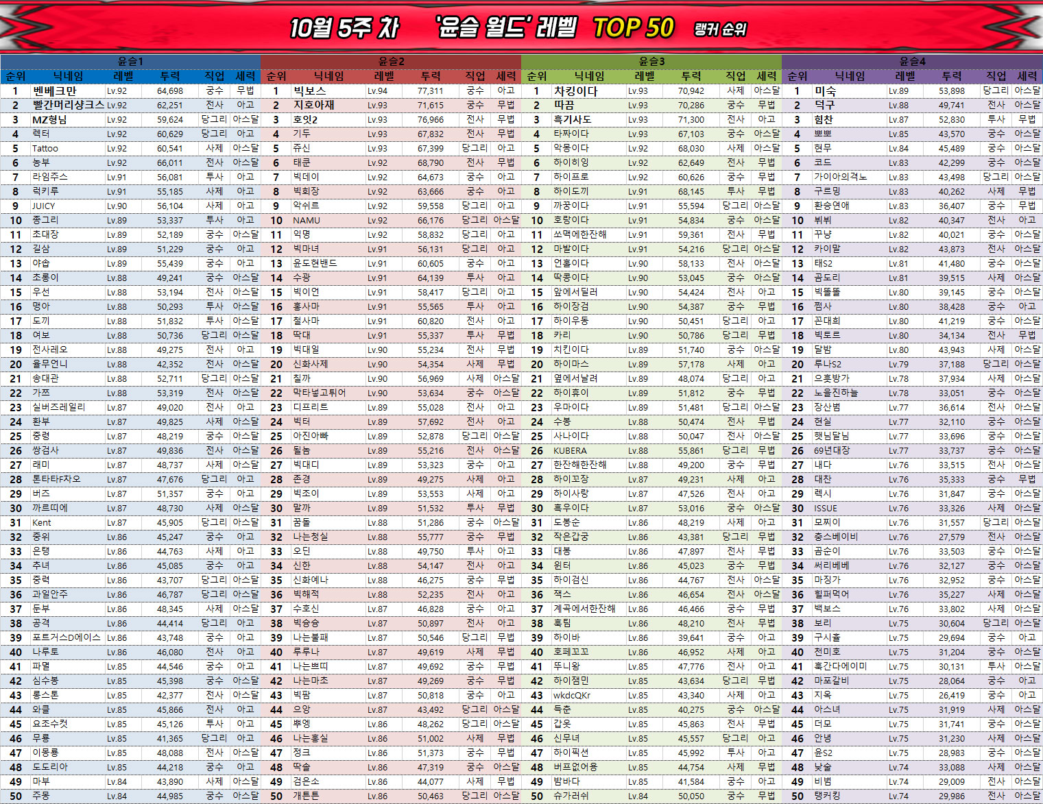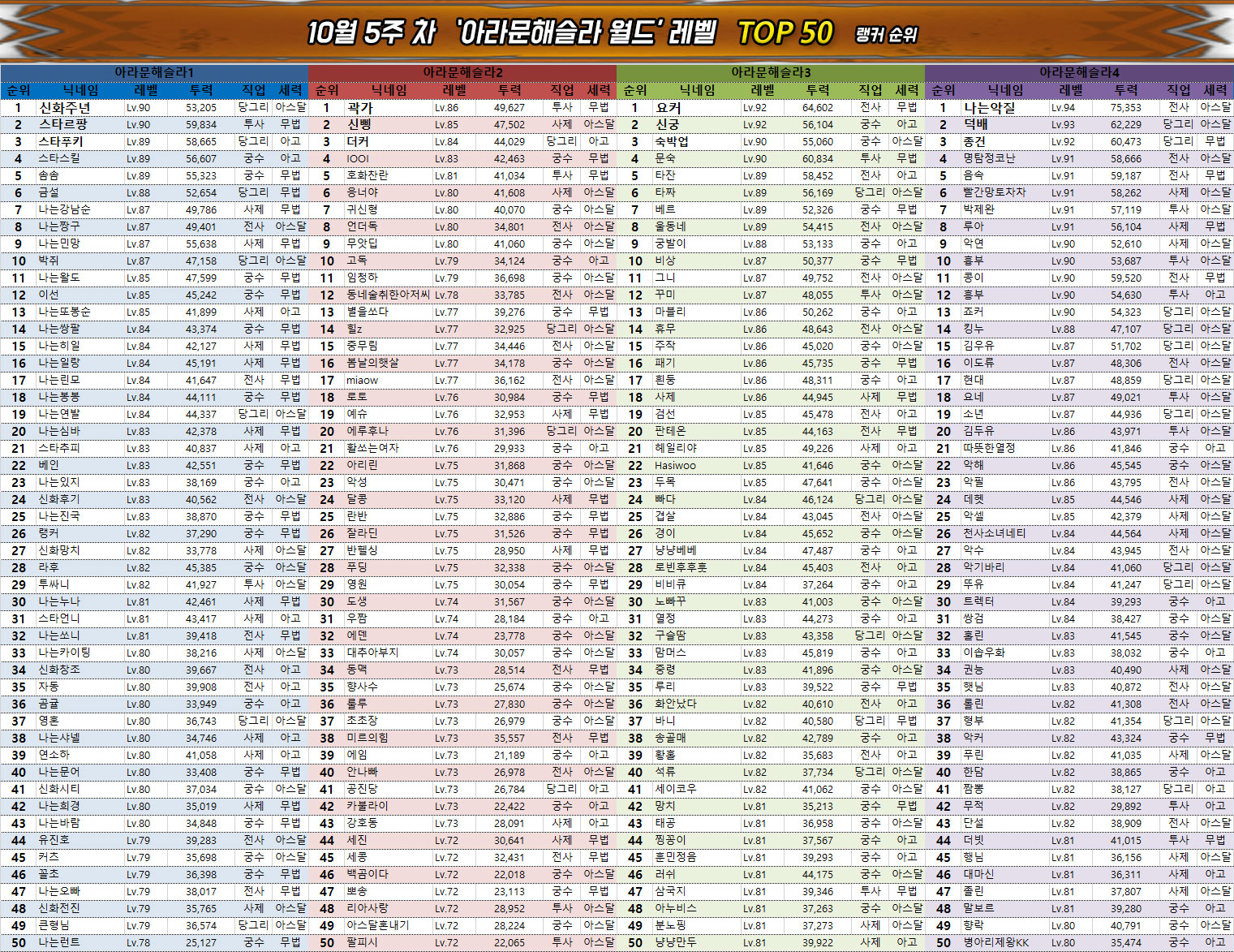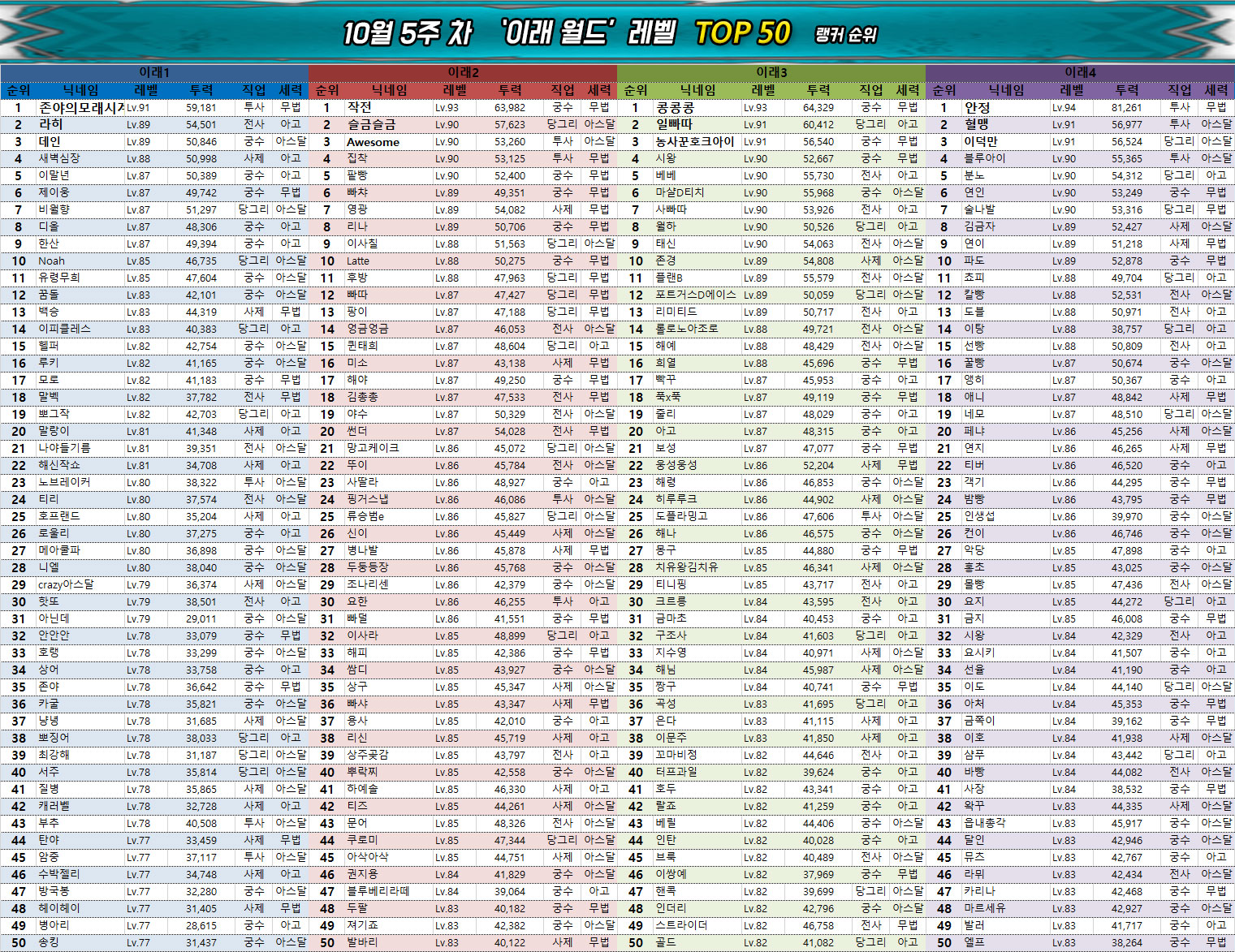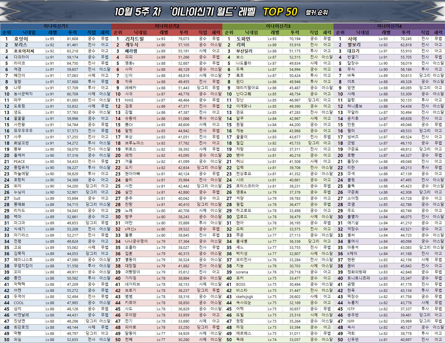 0.5주년 이벤트의 종료와 함께 레벨 인플레이션이 끝난 관계로 월드 및 서버의 평균 레벨에도 큰 변화는 없다. 다만 대부분은 이미 최대한 시간과 자원을 끌어다 쓰며 빌드업을 했기 때문에 사실상 6만 수준의 전투력과 90레벨을 확보하지 못했다면 랭킹 진입은 당분간 어려울 것으로 보인다.