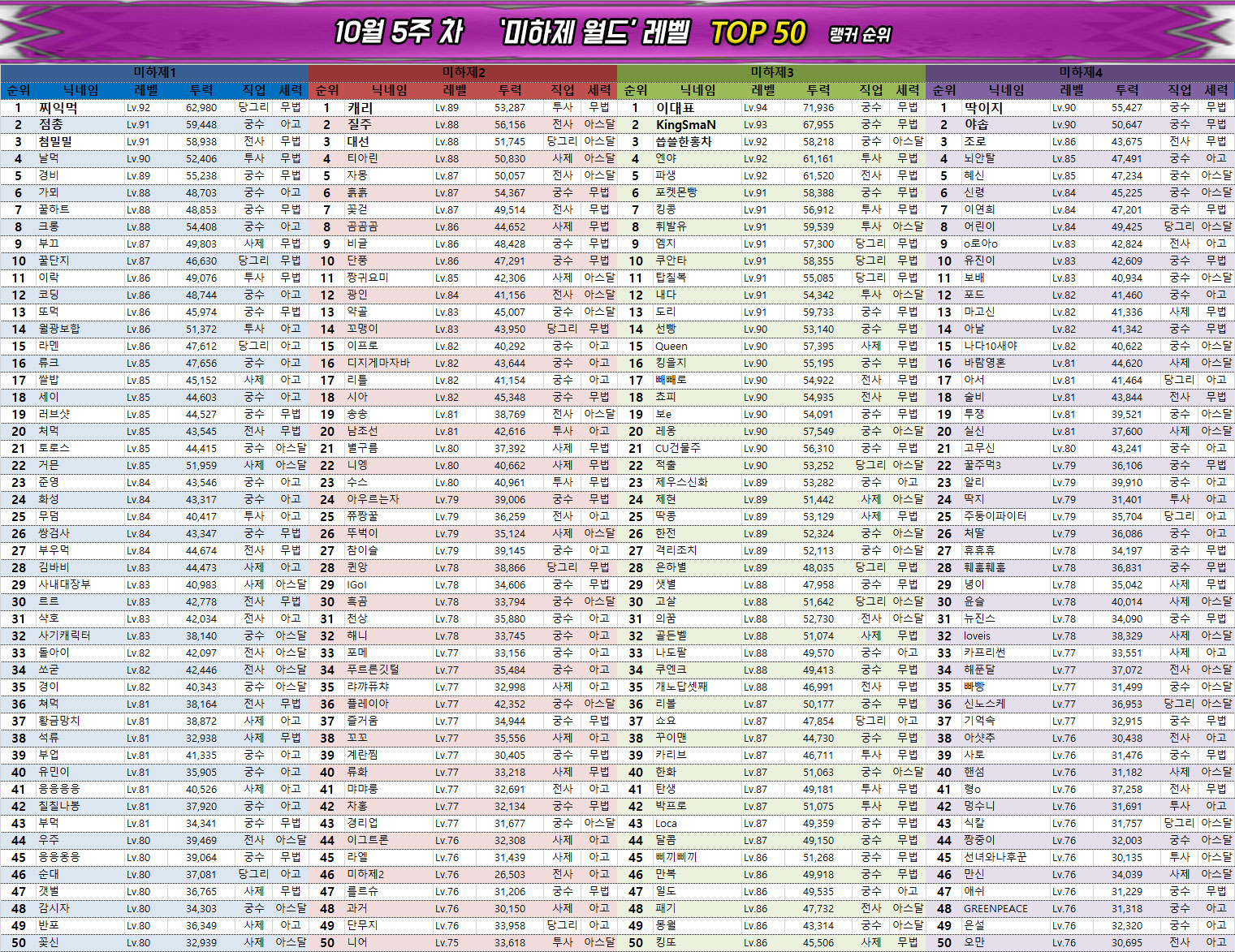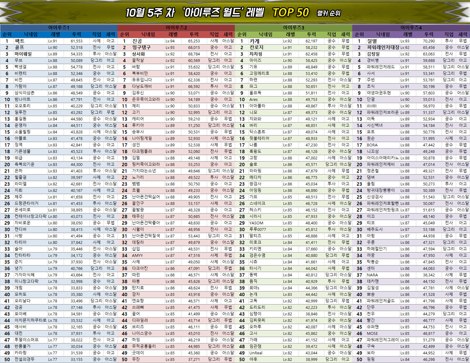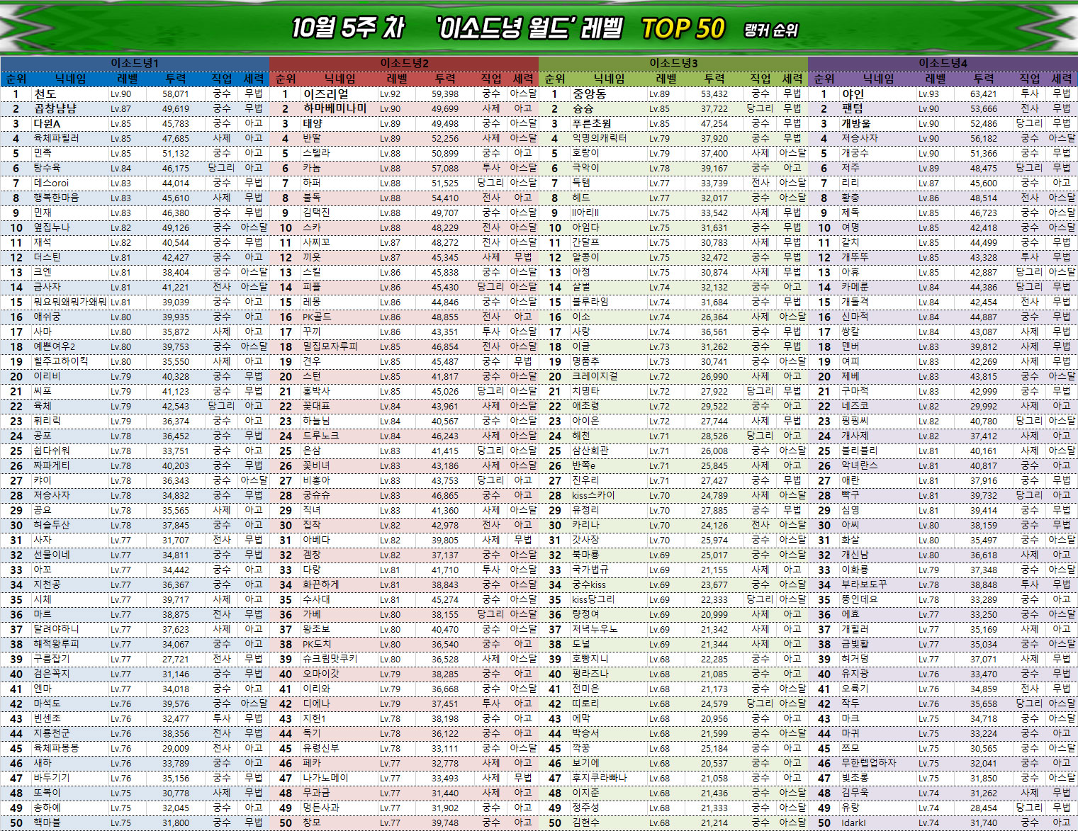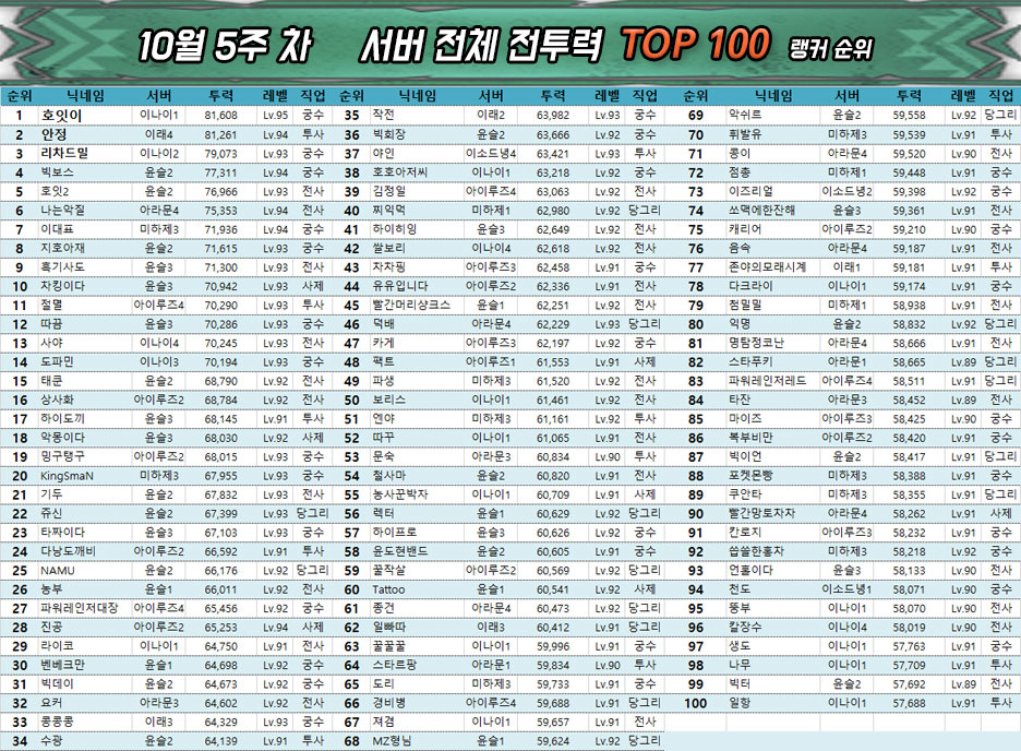 0.5주년 이벤트의 종료와 함께 레벨 인플레이션이 끝난 관계로 월드 및 서버의 평균 레벨에도 큰 변화는 없다. 다만 대부분은 이미 최대한 시간과 자원을 끌어다 쓰며 빌드업을 했기 때문에 사실상 6만 수준의 전투력과 90레벨을 확보하지 못했다면 랭킹 진입은 당분간 어려울 것으로 보인다.