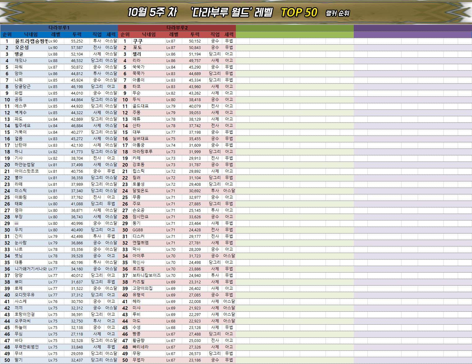 ※ 평균 전투력 및 레벨에서 다라부루1, 2의 데이터는 제외되었습니다.