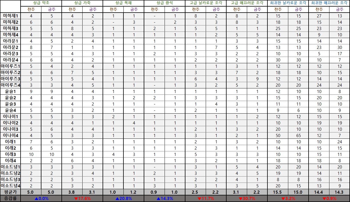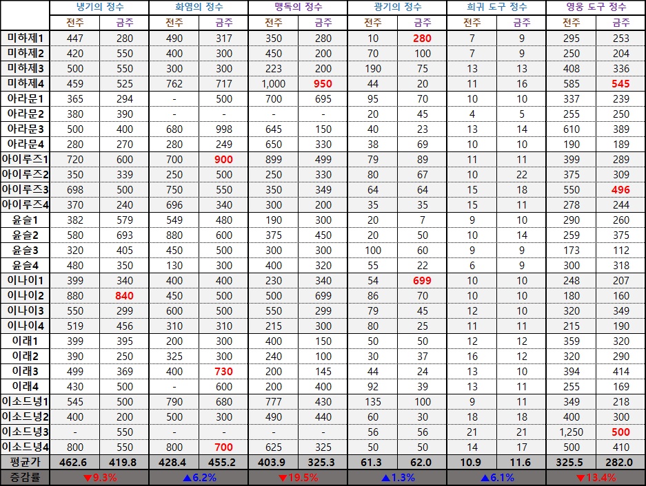 전반적인 검은밤 군도의 보상 획득 조건 및 방식이 개선되고 전체 드롭율 또한 상향 조정되면서 월드 및 서버마다 필요 이상으로 비싼 가격이 형성되어 있었던 필경관 장비의 가격이 적게는 5%에서 24%까지 떨어진 것을 확인할 수 있다.