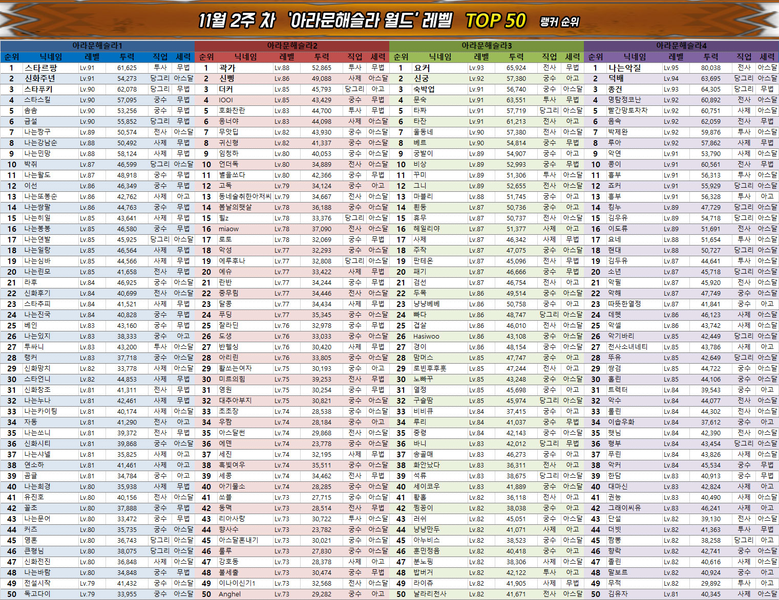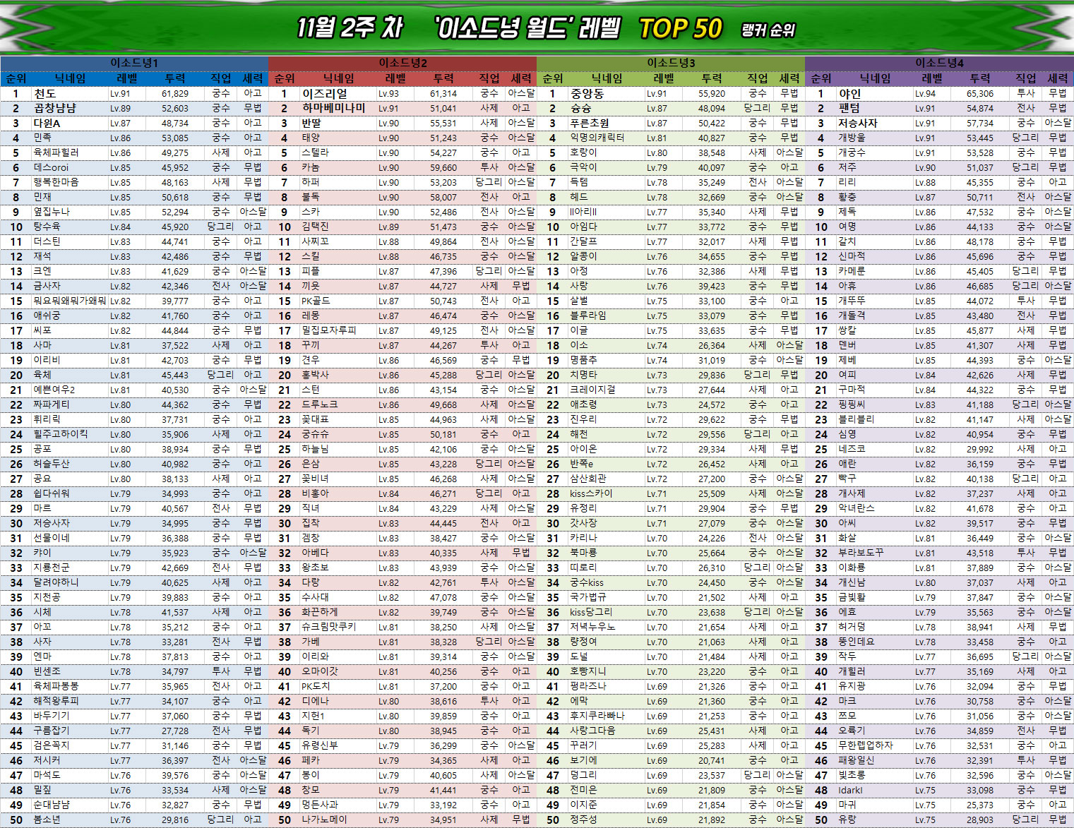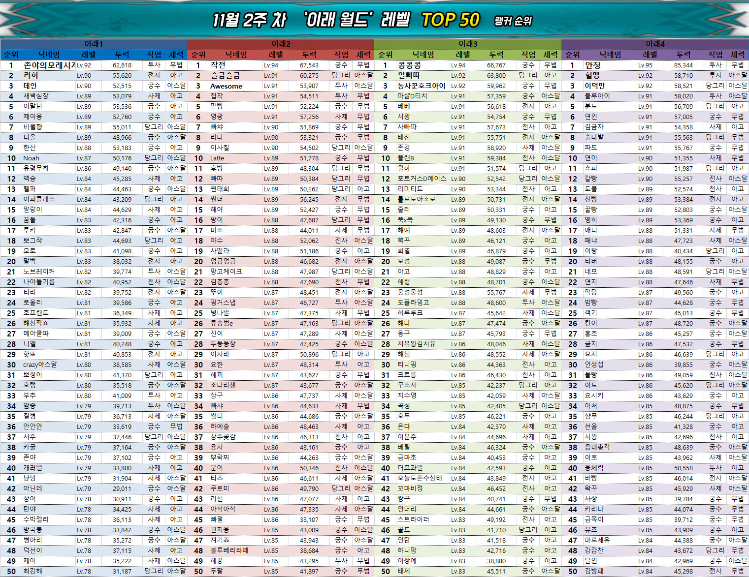그나마 하위권에서는 다라부루 월드의 오은성 유저가 처음으로 랭킹에 진입한 것이 관측됐다. 전투력 6만을 목전에 두고 있는 일부 약소 서버의 랭커들에게는 최근 업데이트가 큰 영향을 주고 있지는 않는 것으로 보이나 천장을 뚫는데 한계를 느끼는 중위권 이용자들을 위해 대체할만한 콘텐츠를 내놓거나 검은밤 군도의 개선이 시급해보이는 상황이다.